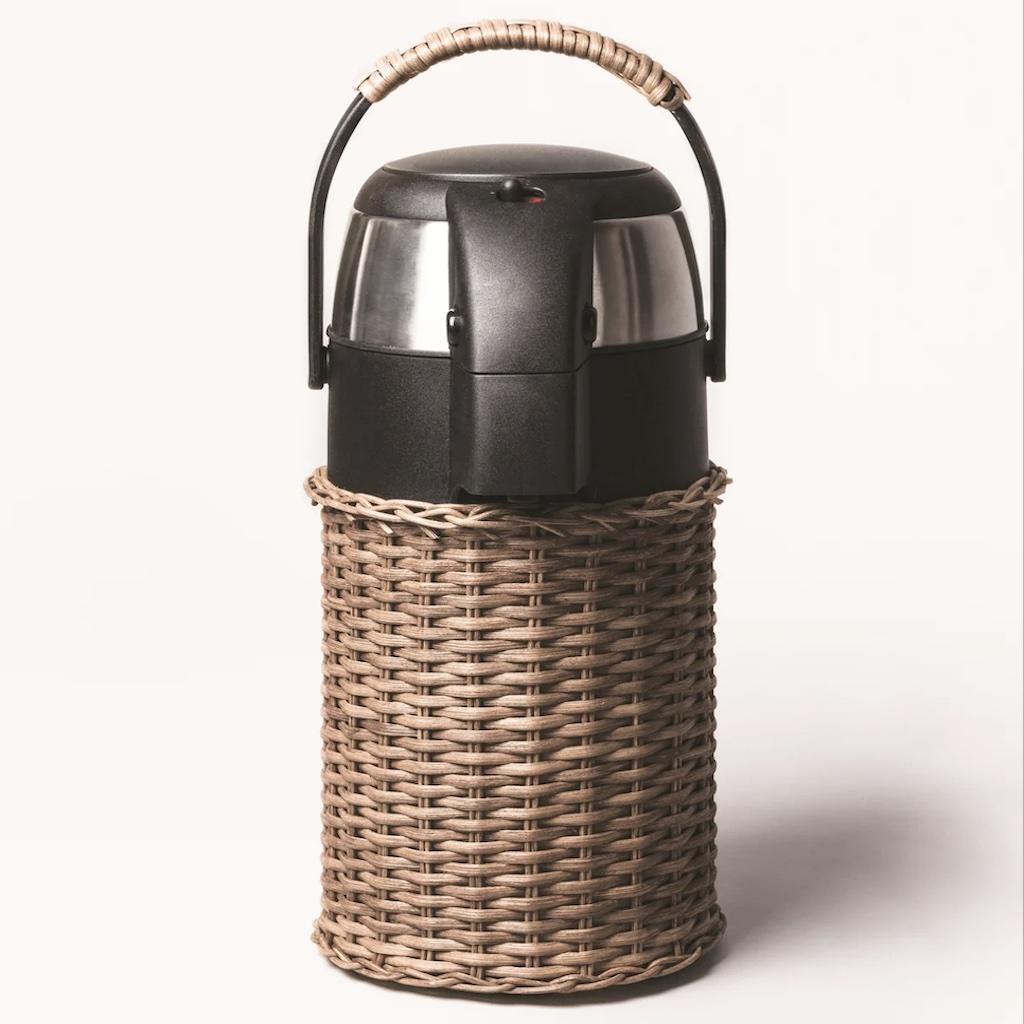 Features pour-trough stopper and removable head. Double wall stainless steel liner with vacuum.