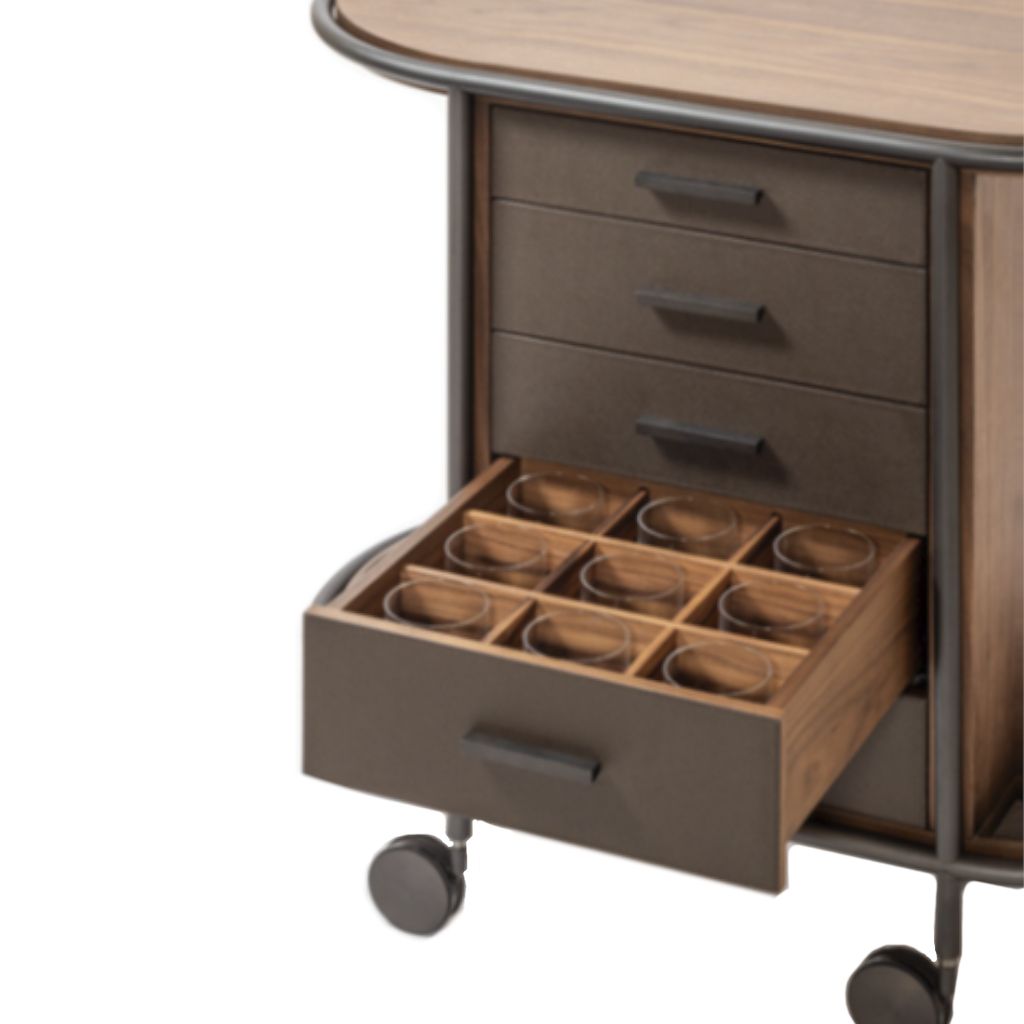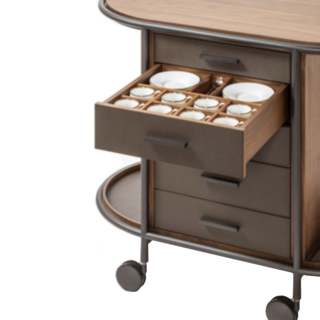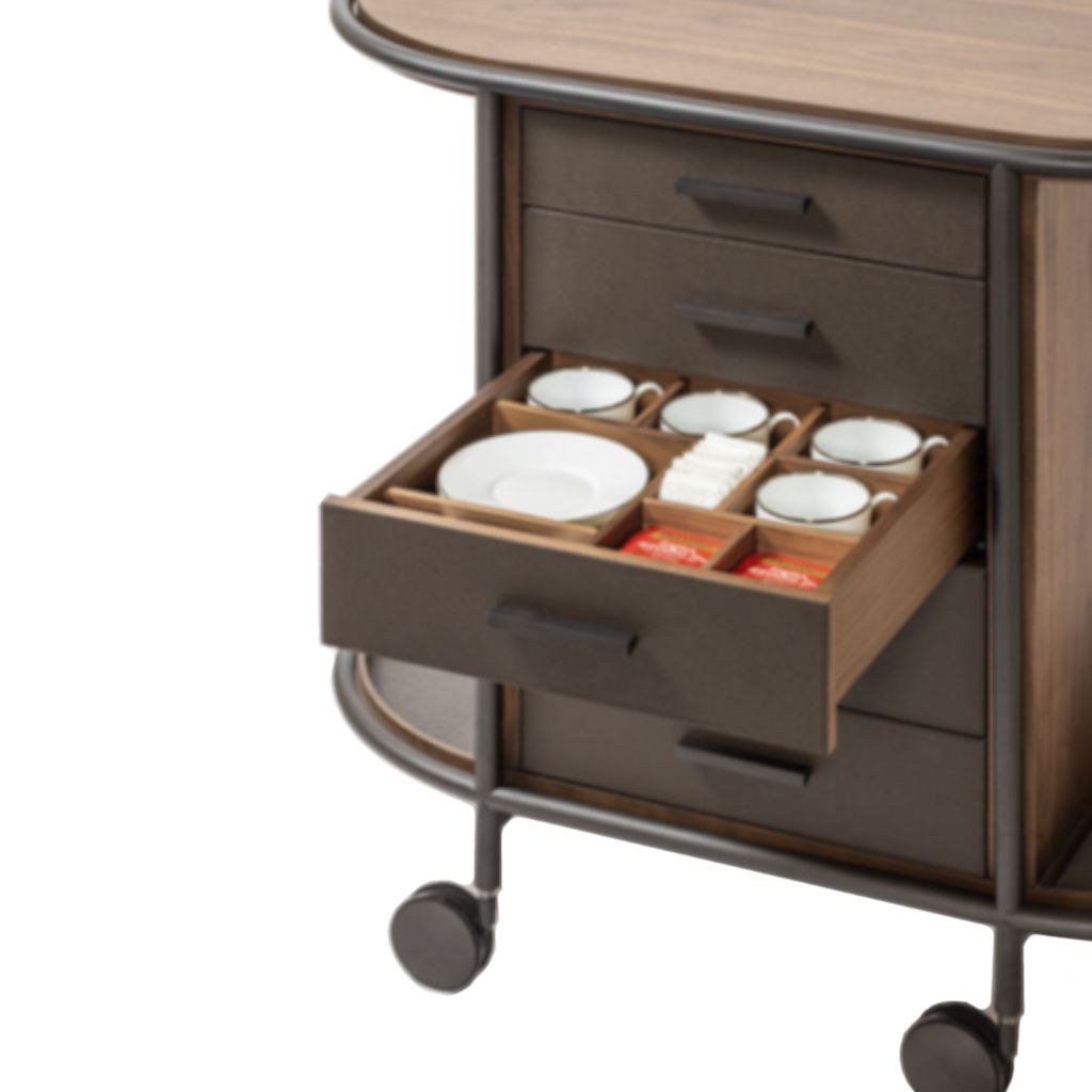 Featuring a four-wheel natural, walnut or wenge structure, a metal frame and wheels available in three finishes, this refined tea and coffee cart is the epitome of functionality and sophistication.