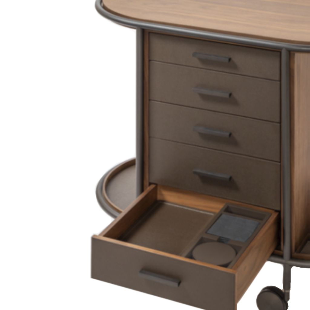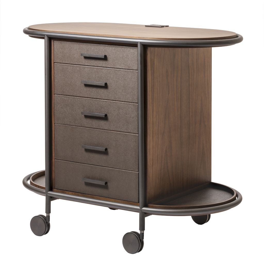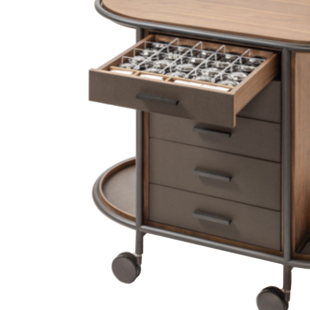 Featuring a four-wheel natural, walnut or wenge structure, a metal frame and wheels available in three finishes, this refined tea and coffee cart is the epitome of functionality and sophistication.
