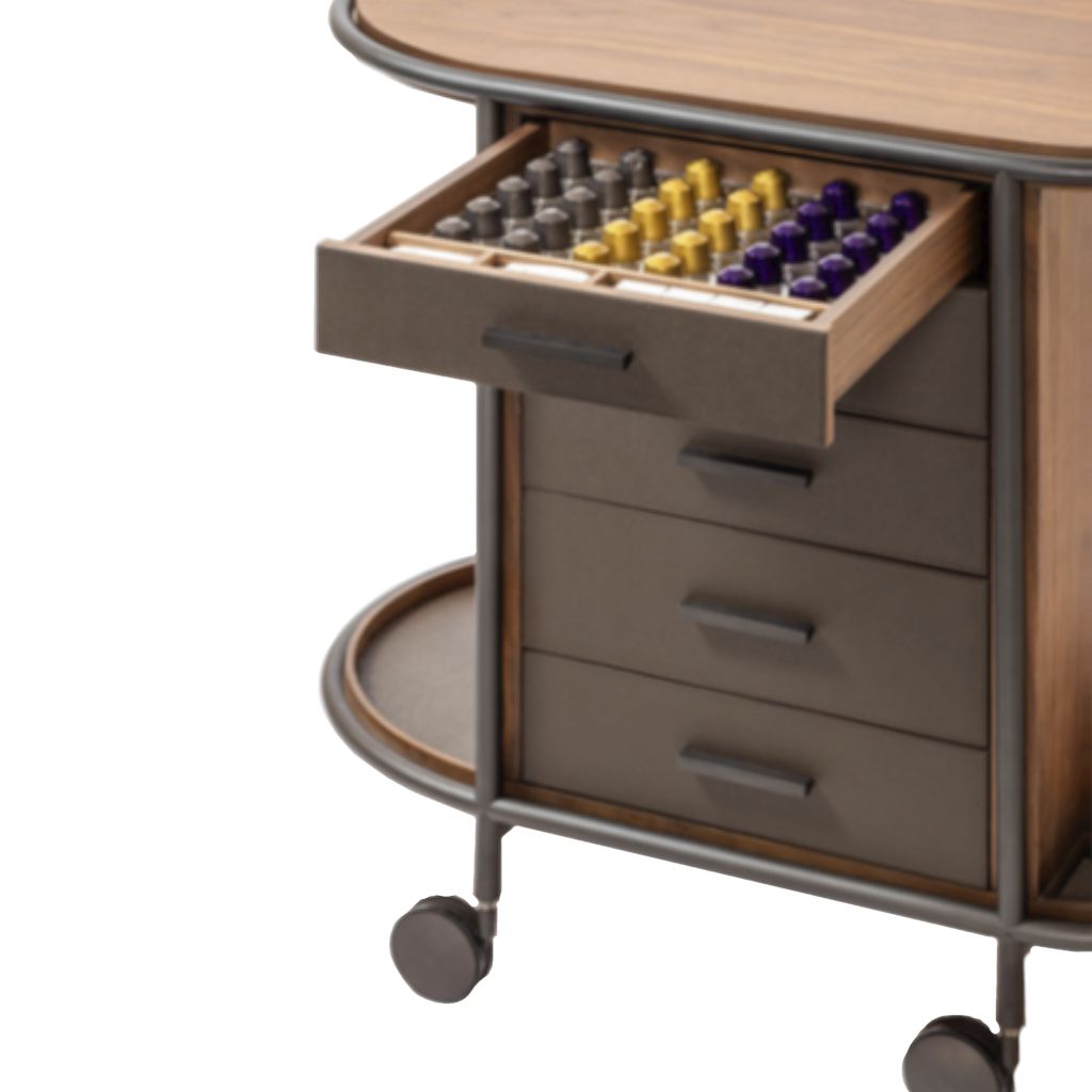 With five organized drawers with sleek metal handles, it provides ample storage for coffee capsules and tea bags, ensuring everything is within reach.