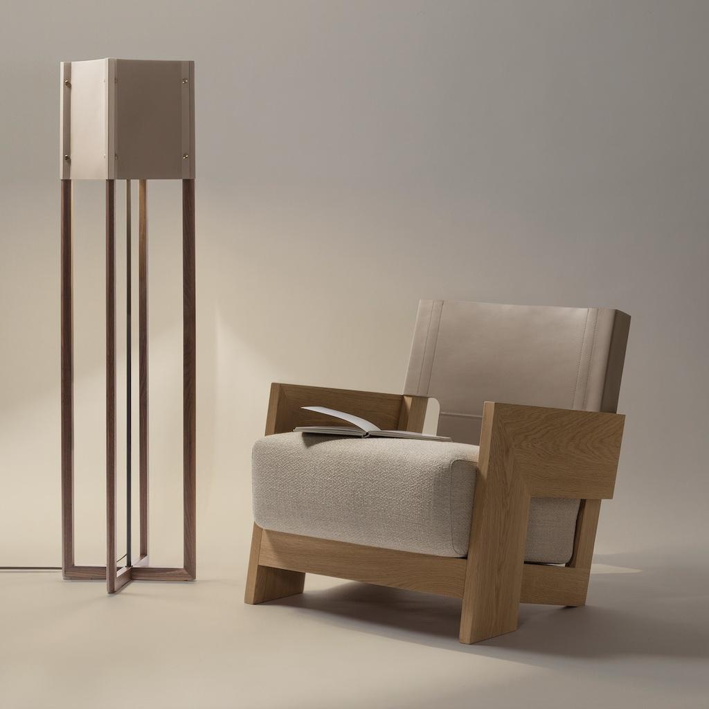 Solid wood structure featuring a saddle leather backrest and upholstered fabric seat.