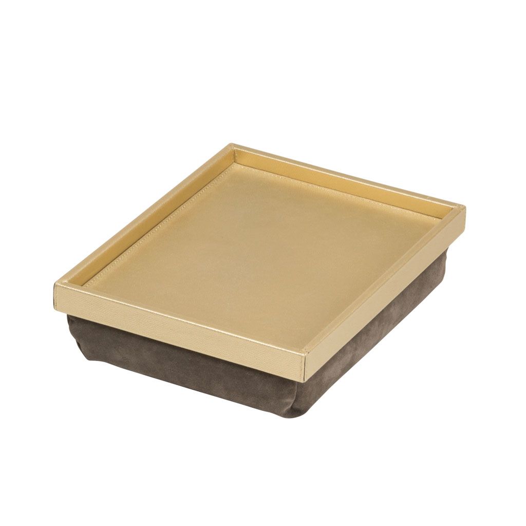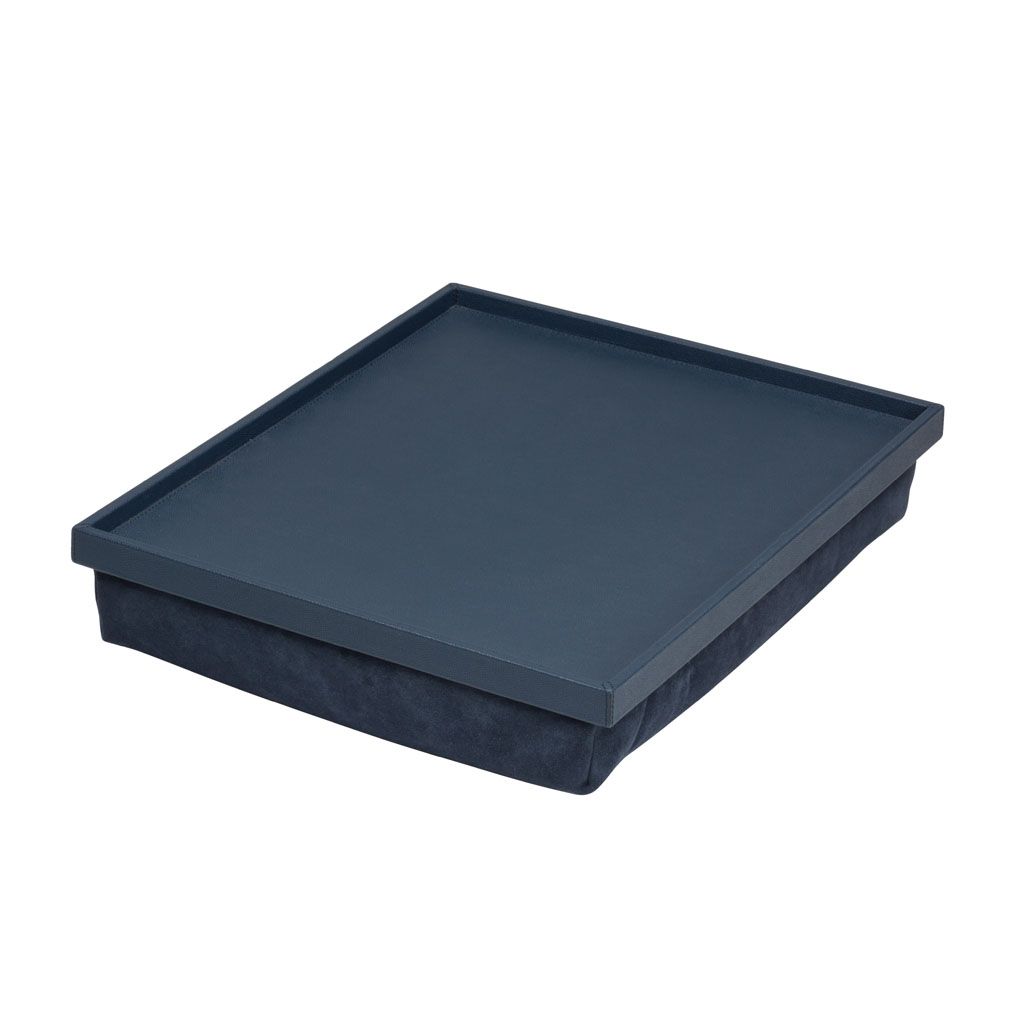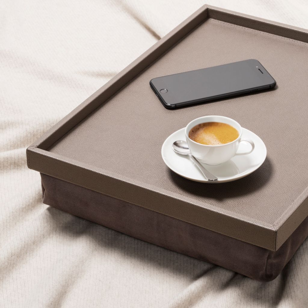 Handcrafted wood tray covered in leather with underlying padding with micro-bead filling.