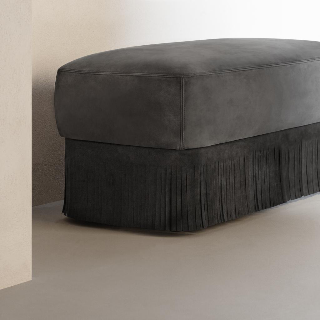 Materials: upholstered leather cushions and fringes. Custom sizes and fabric available on request.