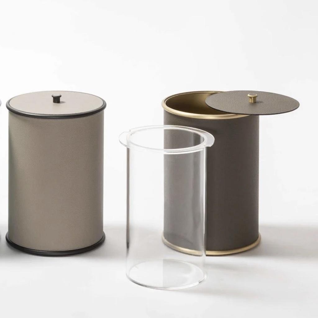 The rigid cylindrical main volumes are rendered softer by the smooth decorative rounded edges, while the finest Italian leather, with its velvety texture, is combined with one among three finishes