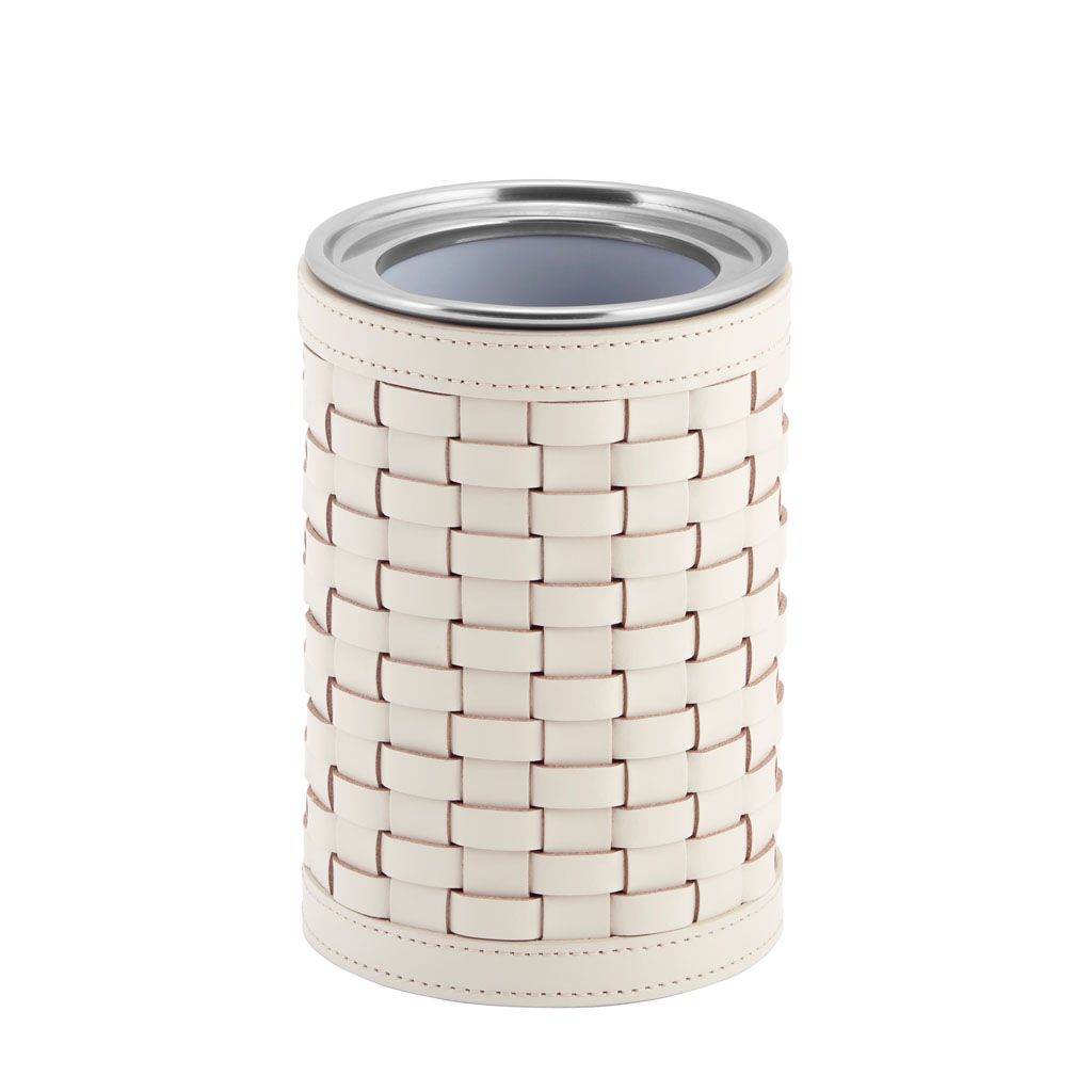 Stainless steel thermic bottle cooler covered with woven leather.
