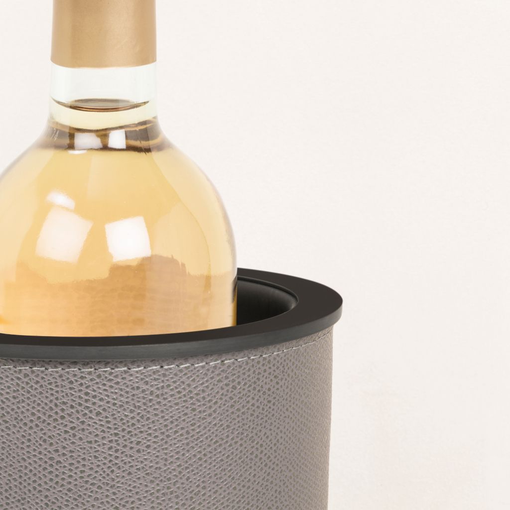 Partially leather covered insulated double chamber brass and stainless steel structure.
