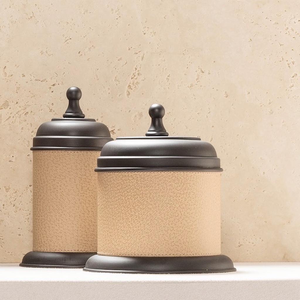 The Dubai bathroom collection features a series of articles with a fine leather-covered metal structure with different finishes of choice.
