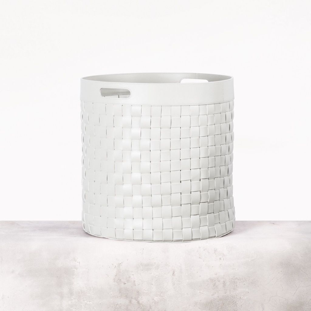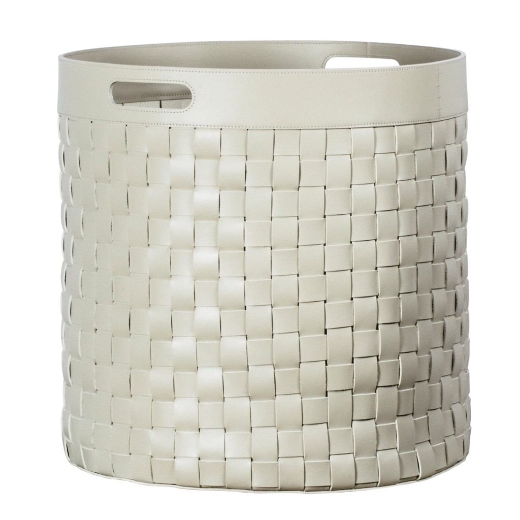 Water resistant woven saddle leather storage basket with handles.