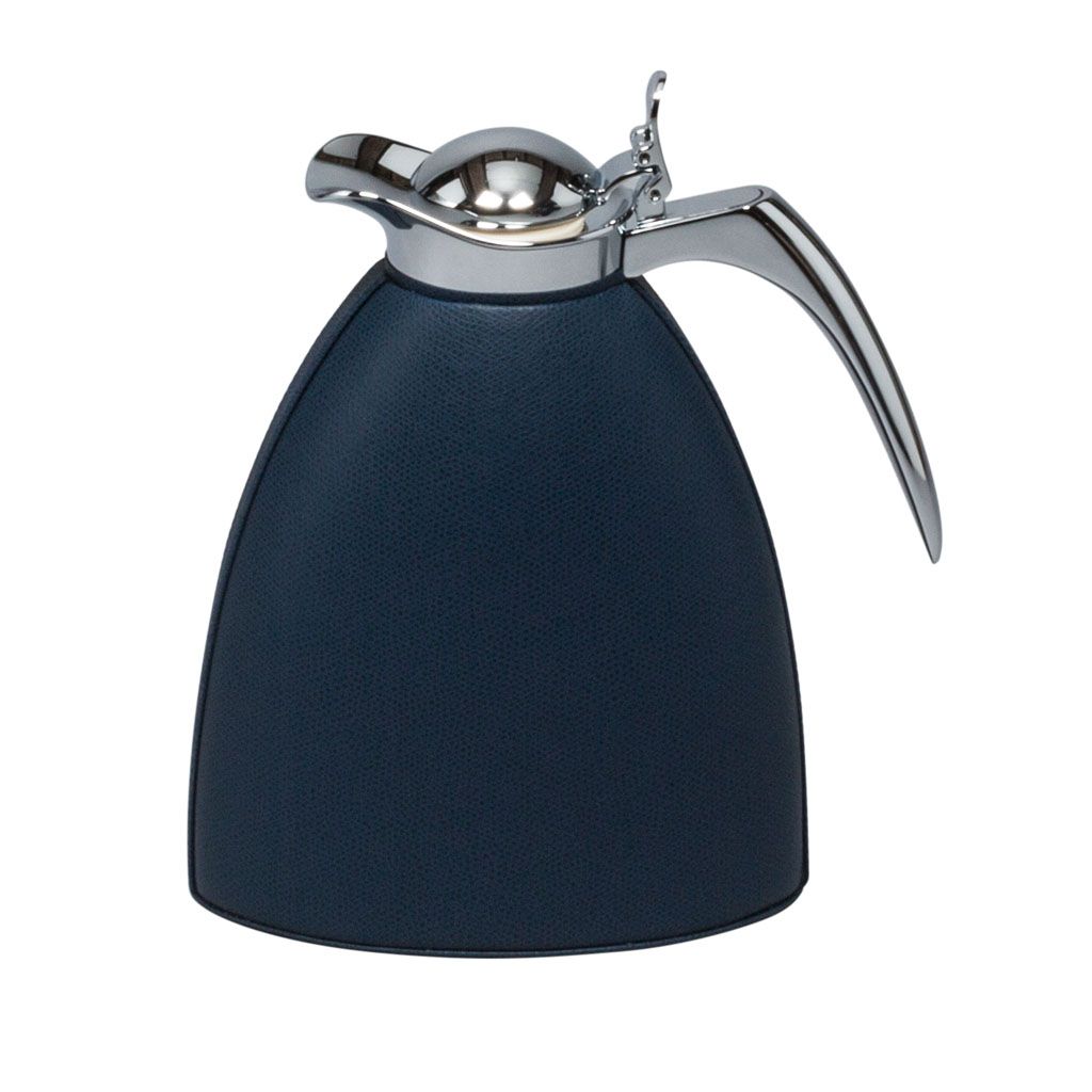Partially leather covered insulated brass carafes with chrome-plated finish.