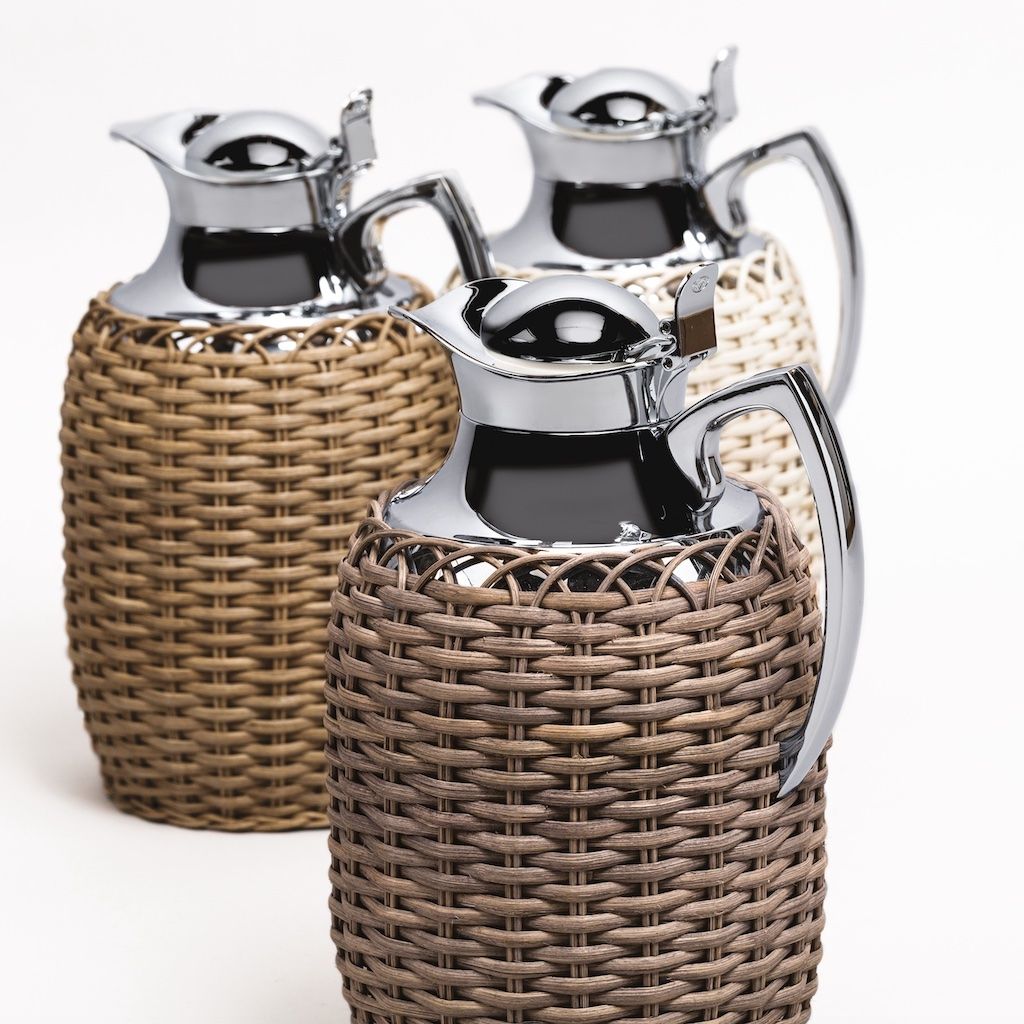 Partially rattan covered insulated brass carafes with chrome plated finish.
