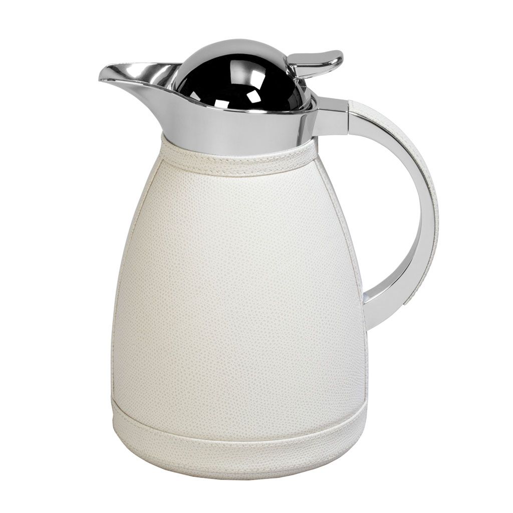 Partially leather covered insulated brass carafes with chrome plated finish.