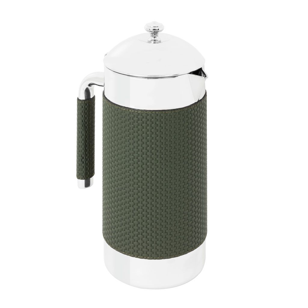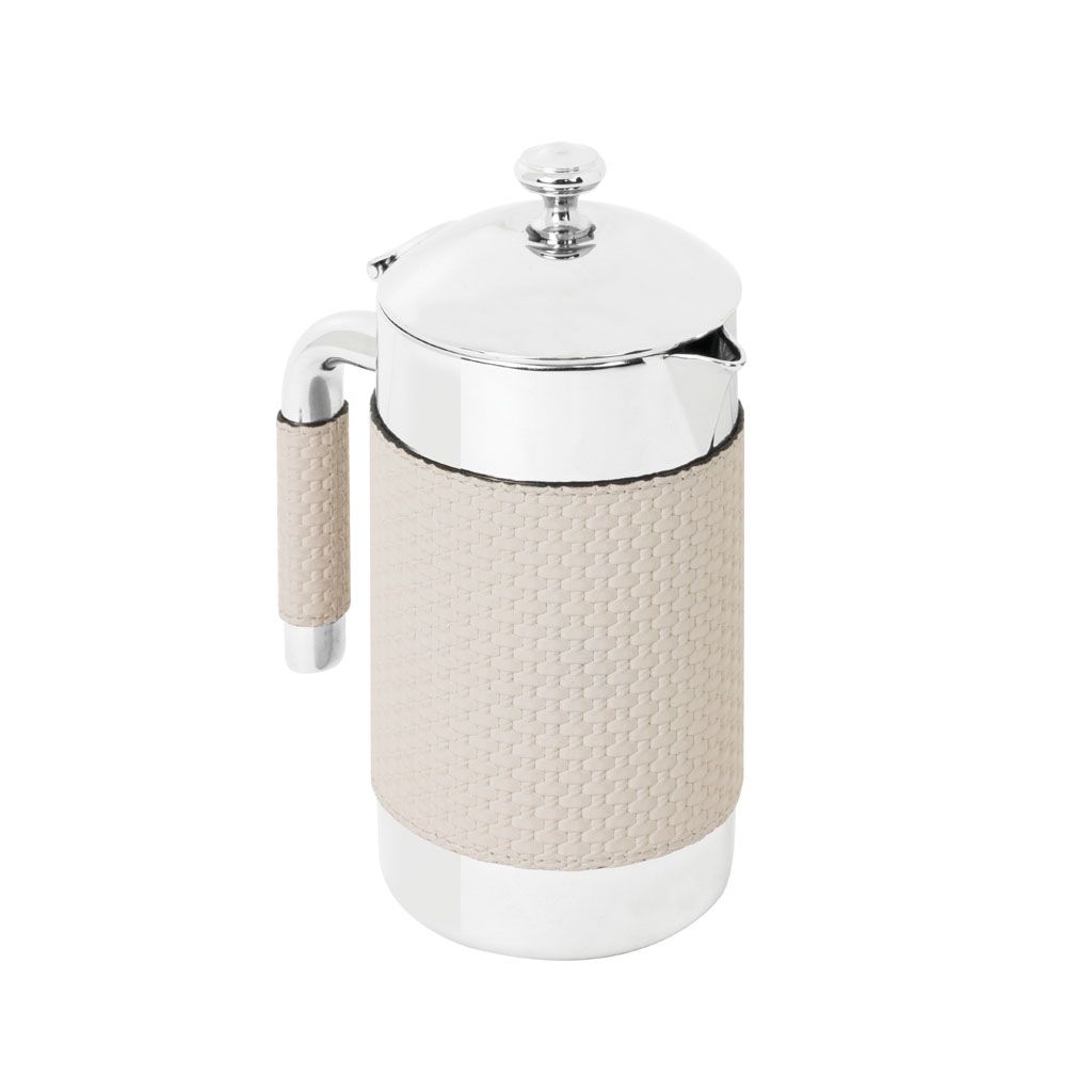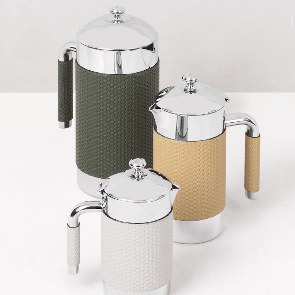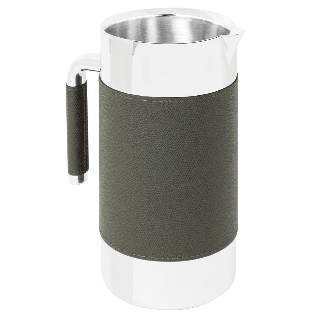 Insulated stainless steel carafes partially covered in leather with chrome plated finish.
