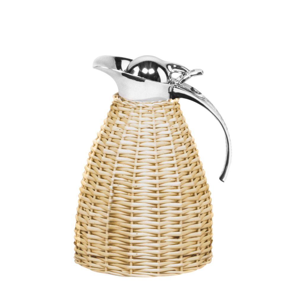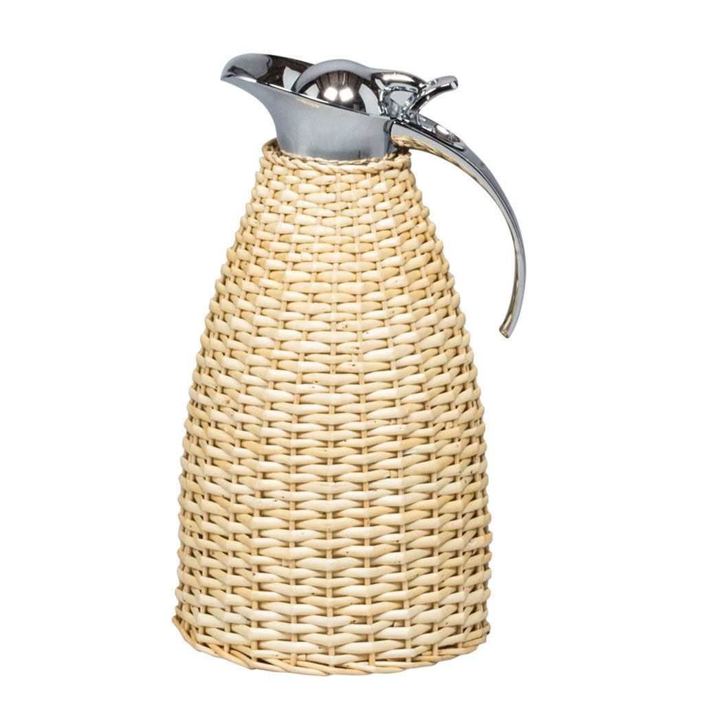 Partially willow covered insulated stainless steel carafes with chrome-plated finish.