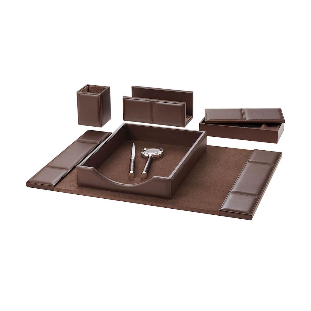 Desk pad with stitched padded leather inserts.