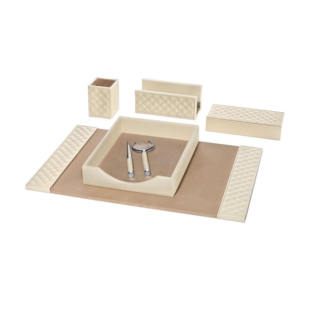 Pen cup with quilted padded leather inserts.