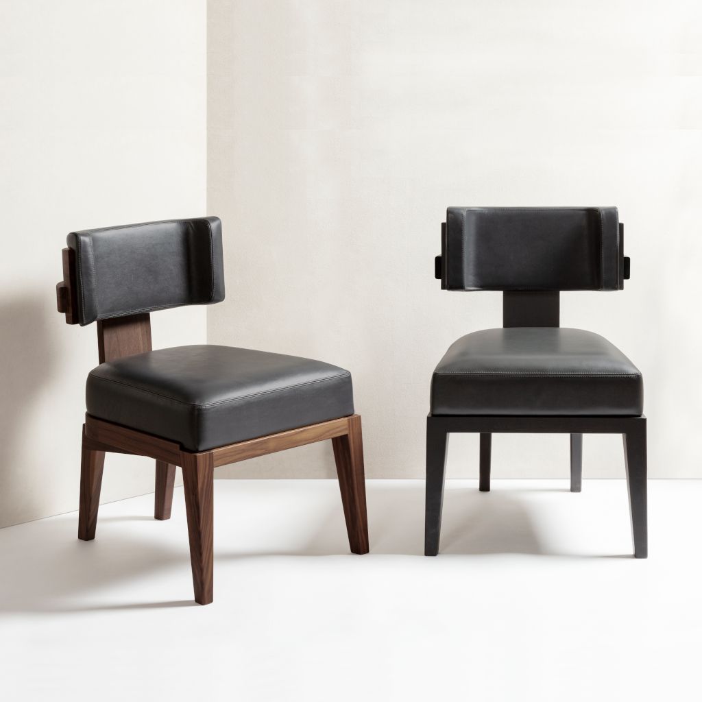 Materials: Canaletto walnut wood structure with upholstered leather cushions.