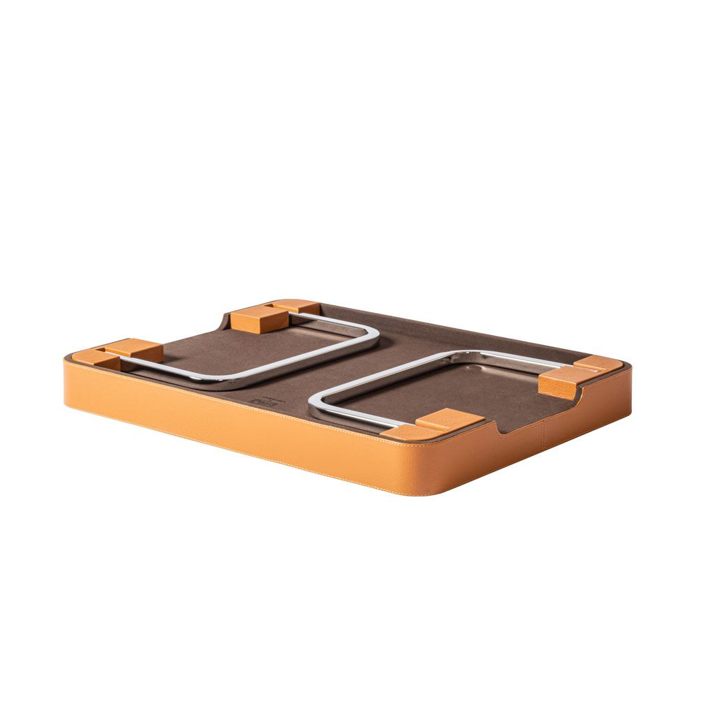 Leather covered wood tray with handles and extractable folding legs with chrome metal finishing.