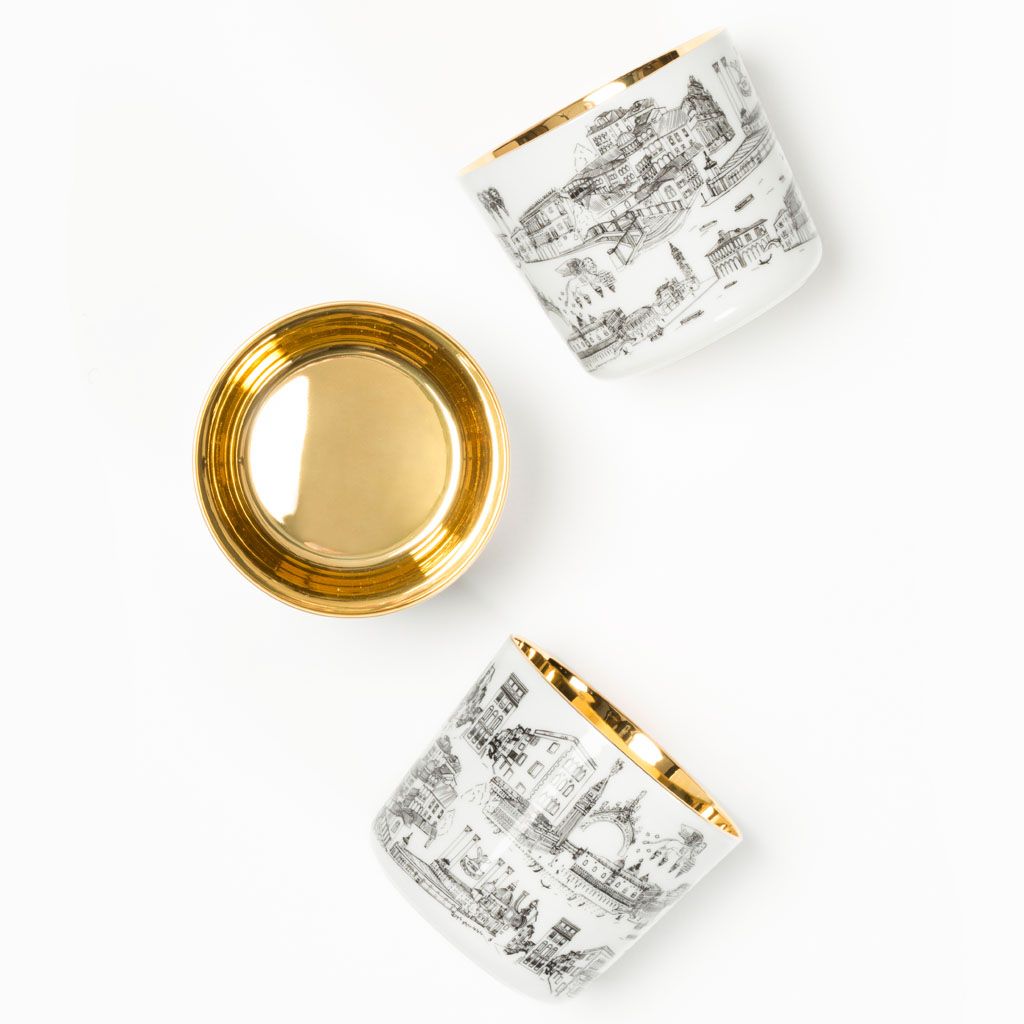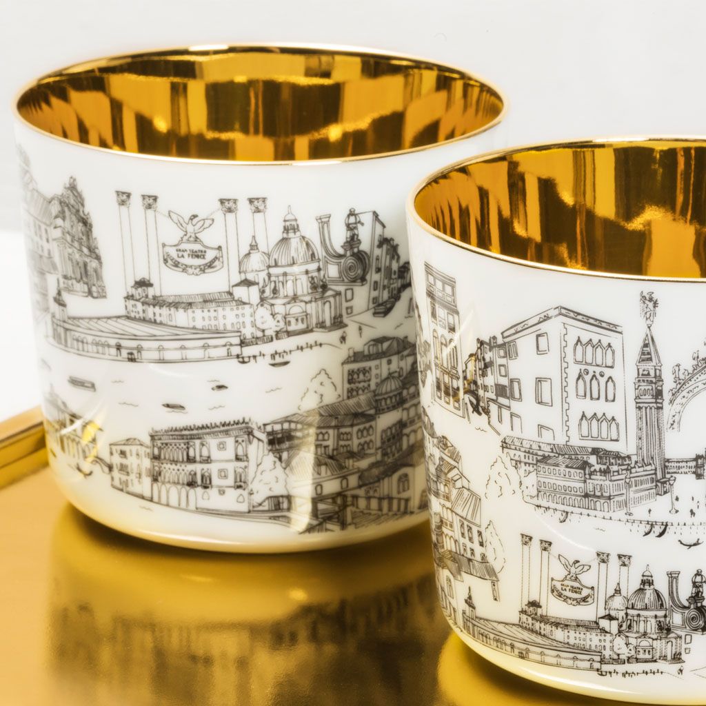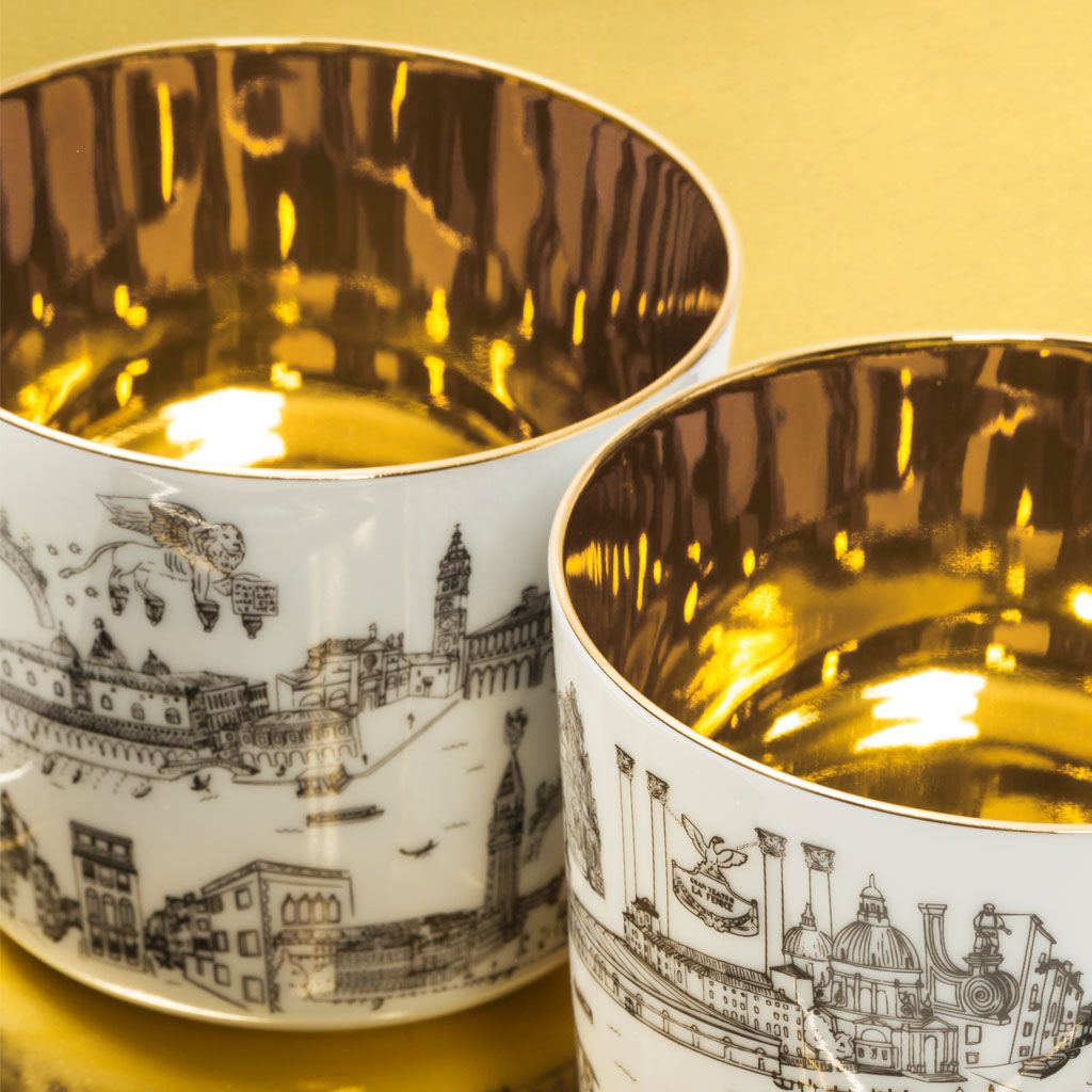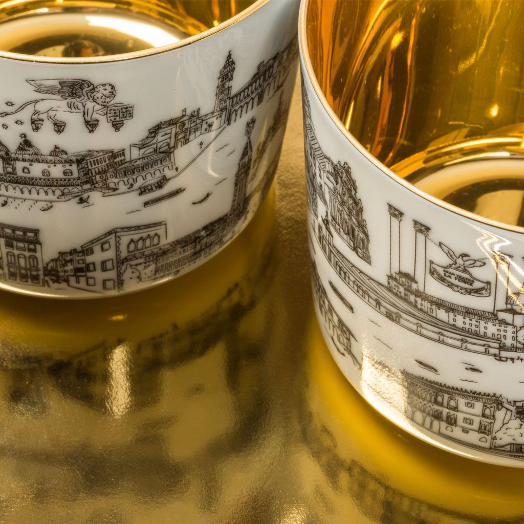 The goblets feature on the outside our store’s unique hand-drawn decoration, which provides a glimpse into the life and monuments of our beautiful and eclectic city and are refined on the inside with 24 carats gold creating the eponymous impression of liquid gold since hundreds of reflections are created in combination with a drink.