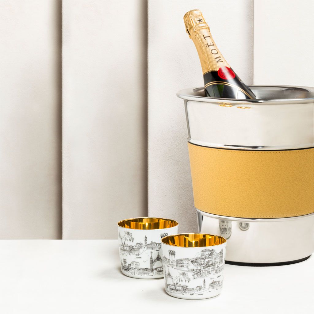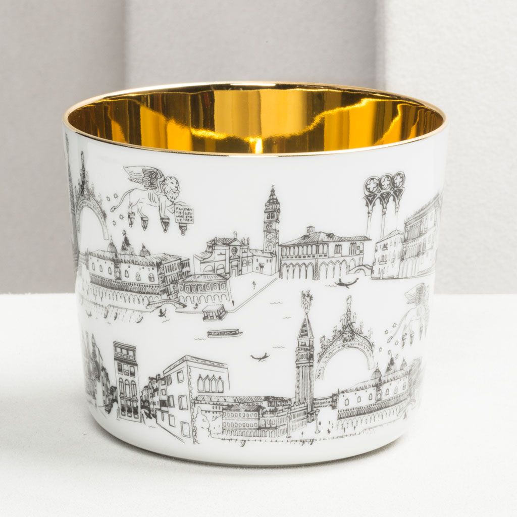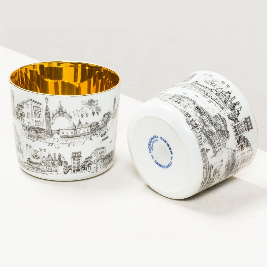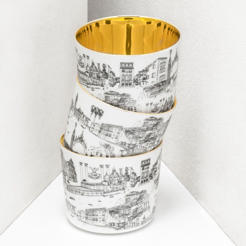 The goblets feature on the outside our store’s unique hand-drawn decoration, which provides a glimpse into the life and monuments of our beautiful and eclectic city and are refined on the inside with 24 carats gold creating the eponymous impression of liquid gold since hundreds of reflections are created in combination with a drink.