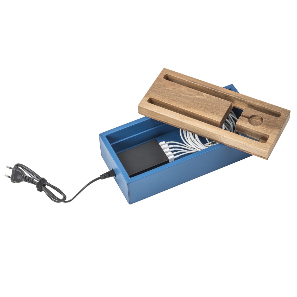 Multi device charging station. It hosts an high quality 5-Port USB charger able to recharge 5 devices simultaneously ( 2 smartphones, 1 tablet, 1 apple watch) and provides a comfortable view, in integrated on the wooden top and dressed up in leather to march the color of the wood.