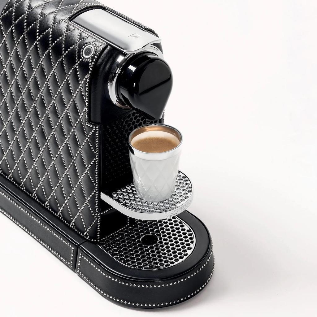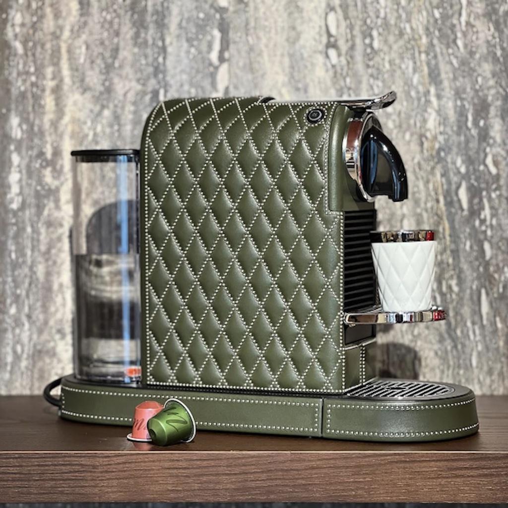 Original Nespresso machine dressed in leather with a diamonds or straight lines quilt pattern generated by the juxtaposition of small studs.