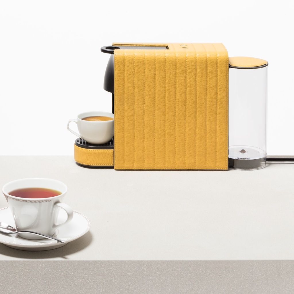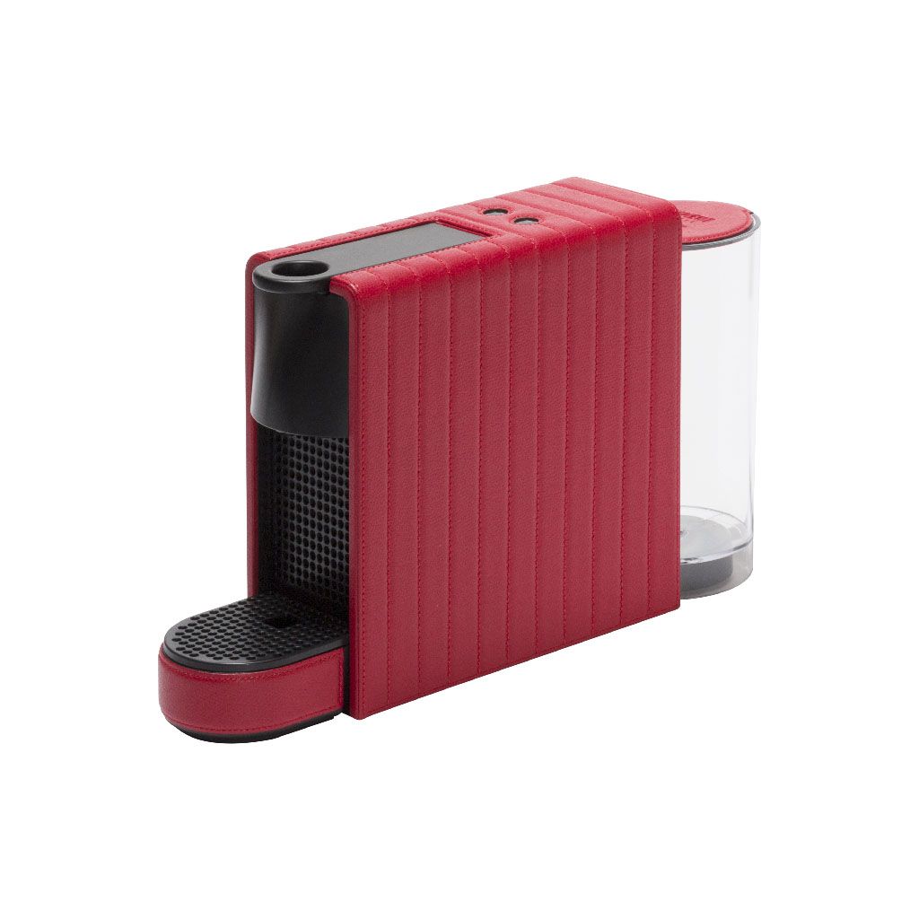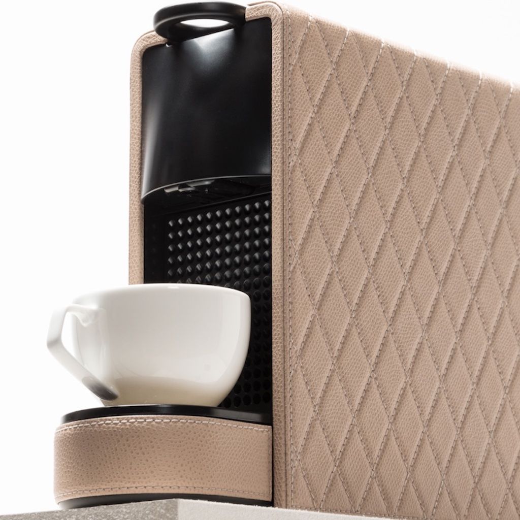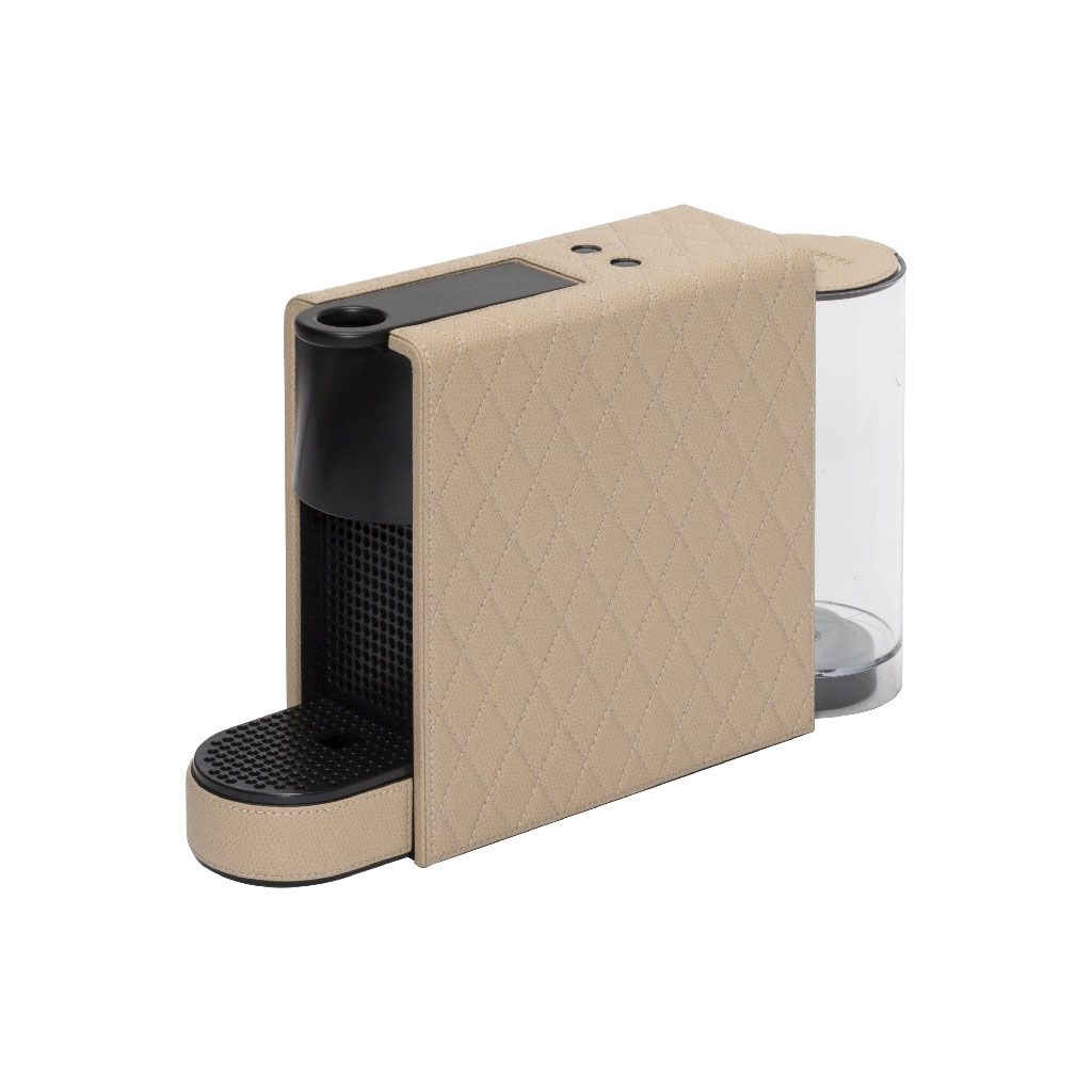 Original leather-bound Nespresso machine with a lines or diamonds quilt pattern. It use classic Nespresso capsules.