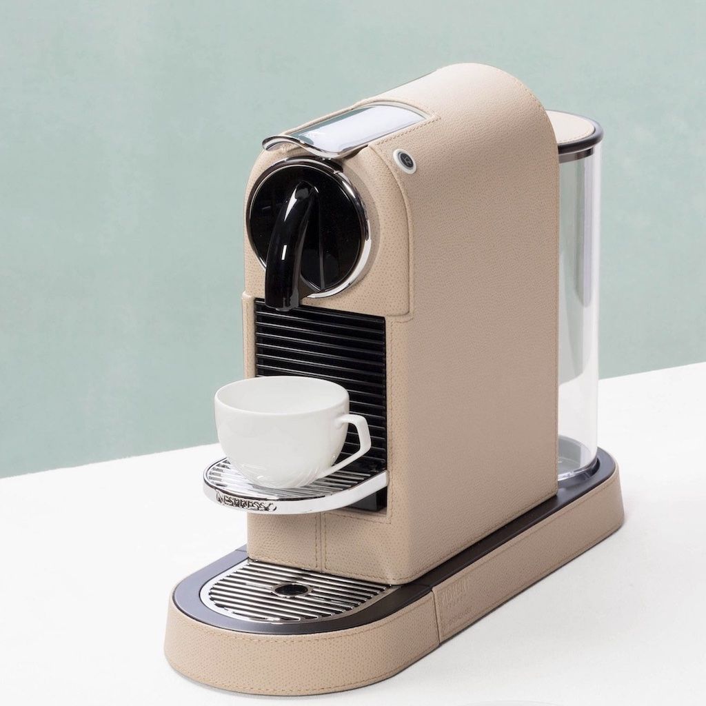 Simplified version for hospitality. Leather-bound Nespresso machine. It uses classic Nespresso capsules.