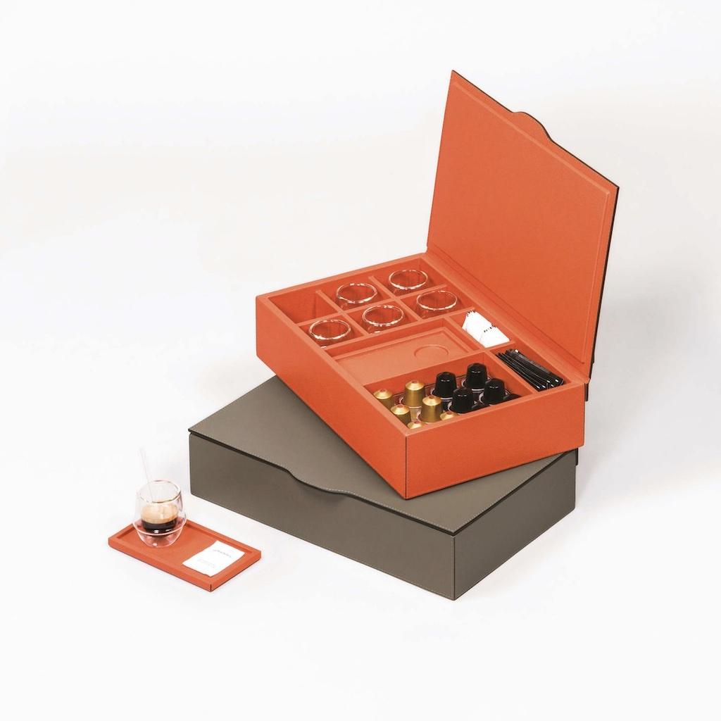 Inner partitions to host coffee scoops and sugar, 24 Nespresso capsules, 6 double wall borosilicate glass cups included, and 6 nesting rectangular saucers included.