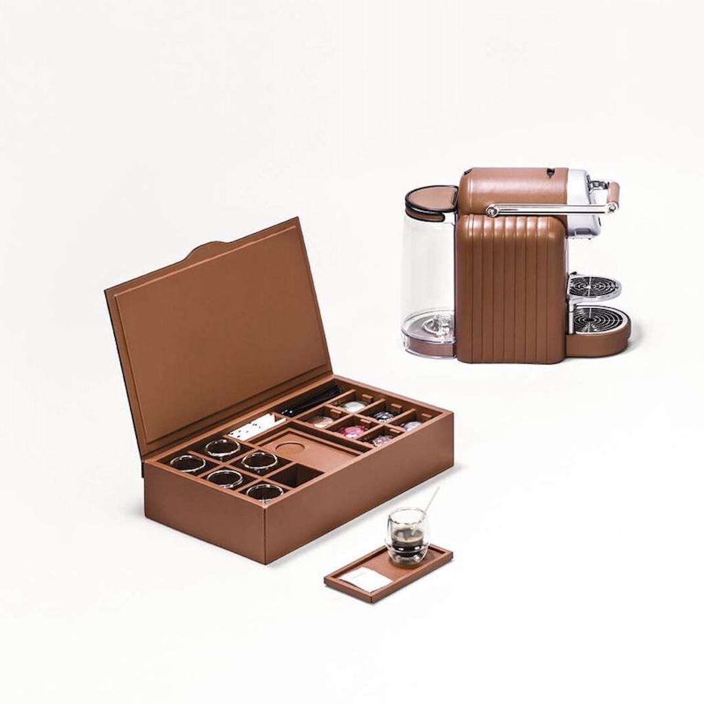 Inner partitions to host coffee scoops and sugar, 24 Nespresso commercial capsules, 6 double wall borosilicate glass cups included, and 6 nesting rectangular saucers included.