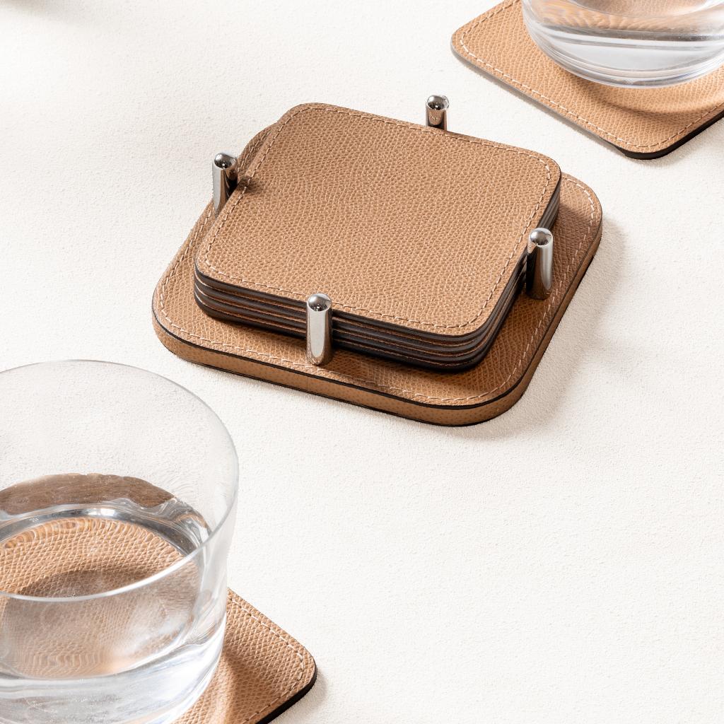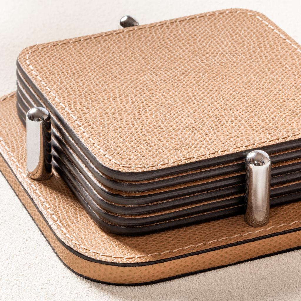 Leather covered wood structure able to host 6 Tao coasters semi-flexible and waterproof.