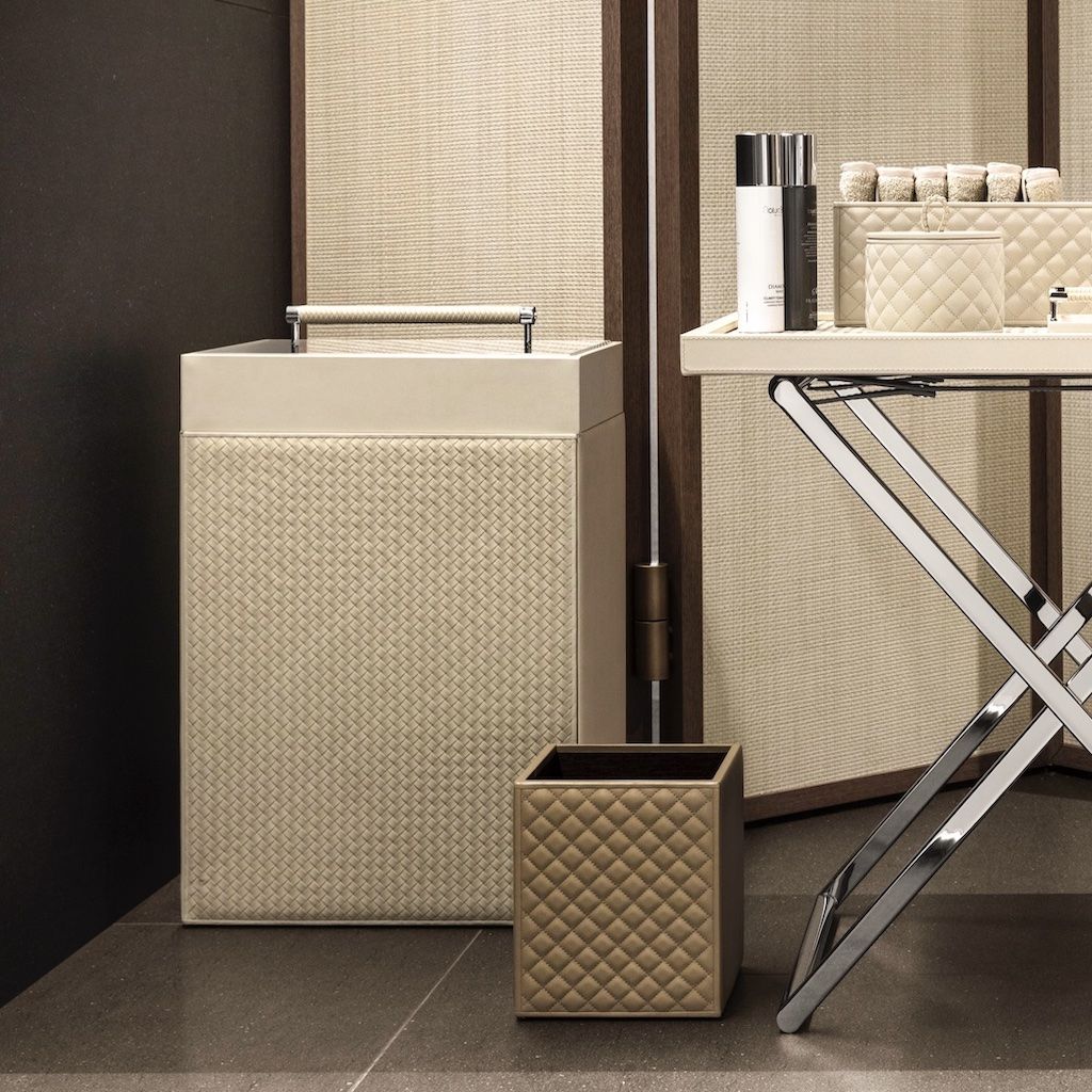 Quilted diamonds leather laundry basket, lining in varnished wood and acrylic lid with woven leather handle and chrome or gold details.