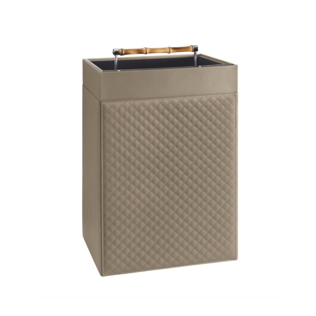 Quilted diamonds leather laundry basket, lining in varnished wood and acrylic lid with bamboo handle and chrome details.