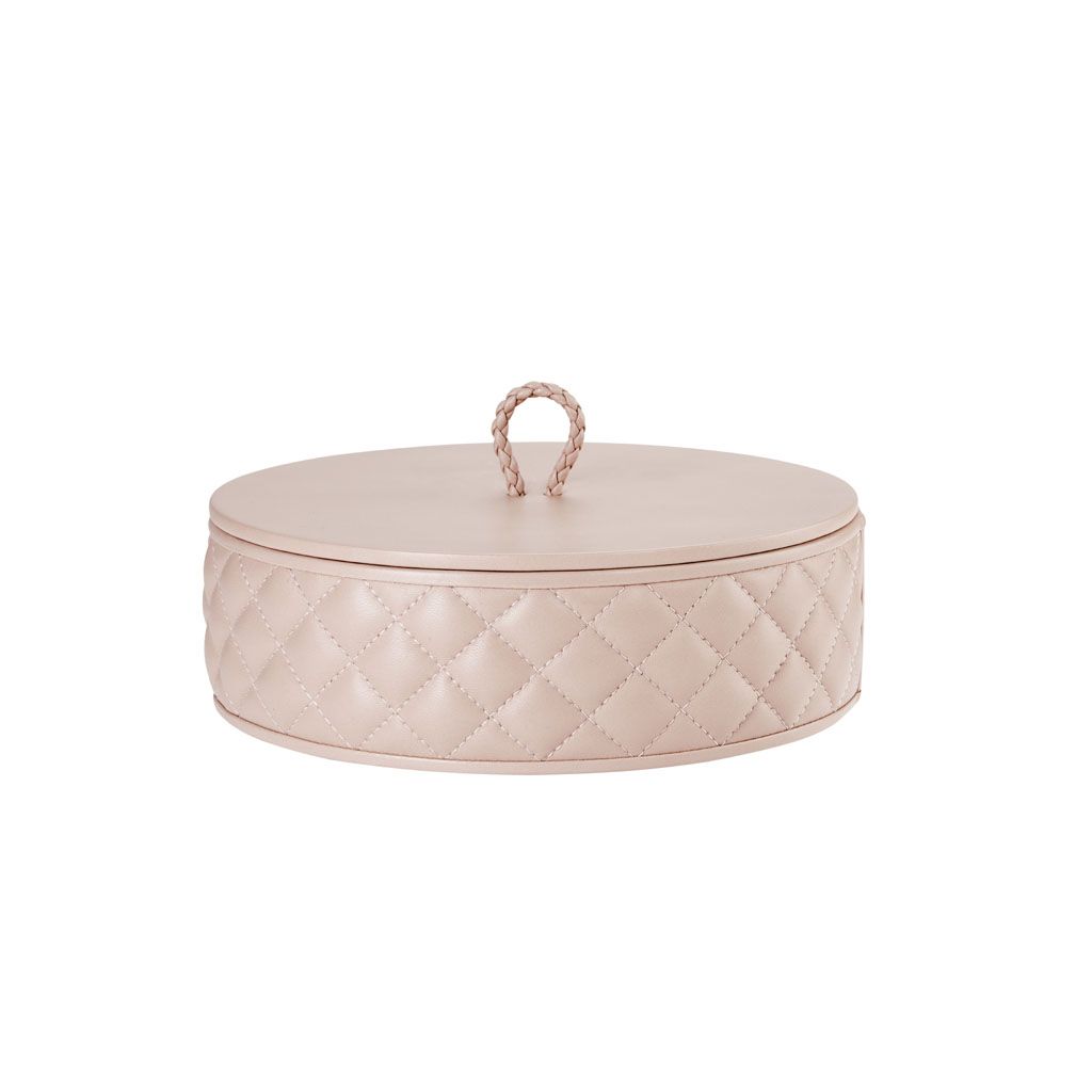 Round leather box with lid, quilted diamonds padded finish.