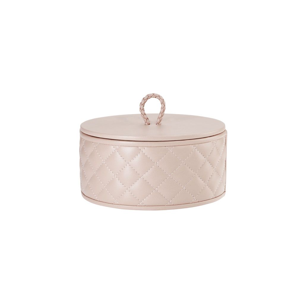 Round leather box with lid, quilted diamonds padded finish.