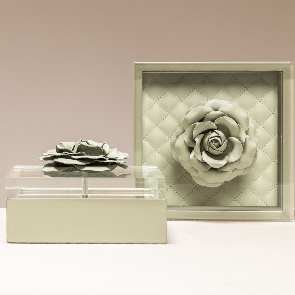 Leather box with acrylic lid, quilted diamonds padded lining and leather flower.