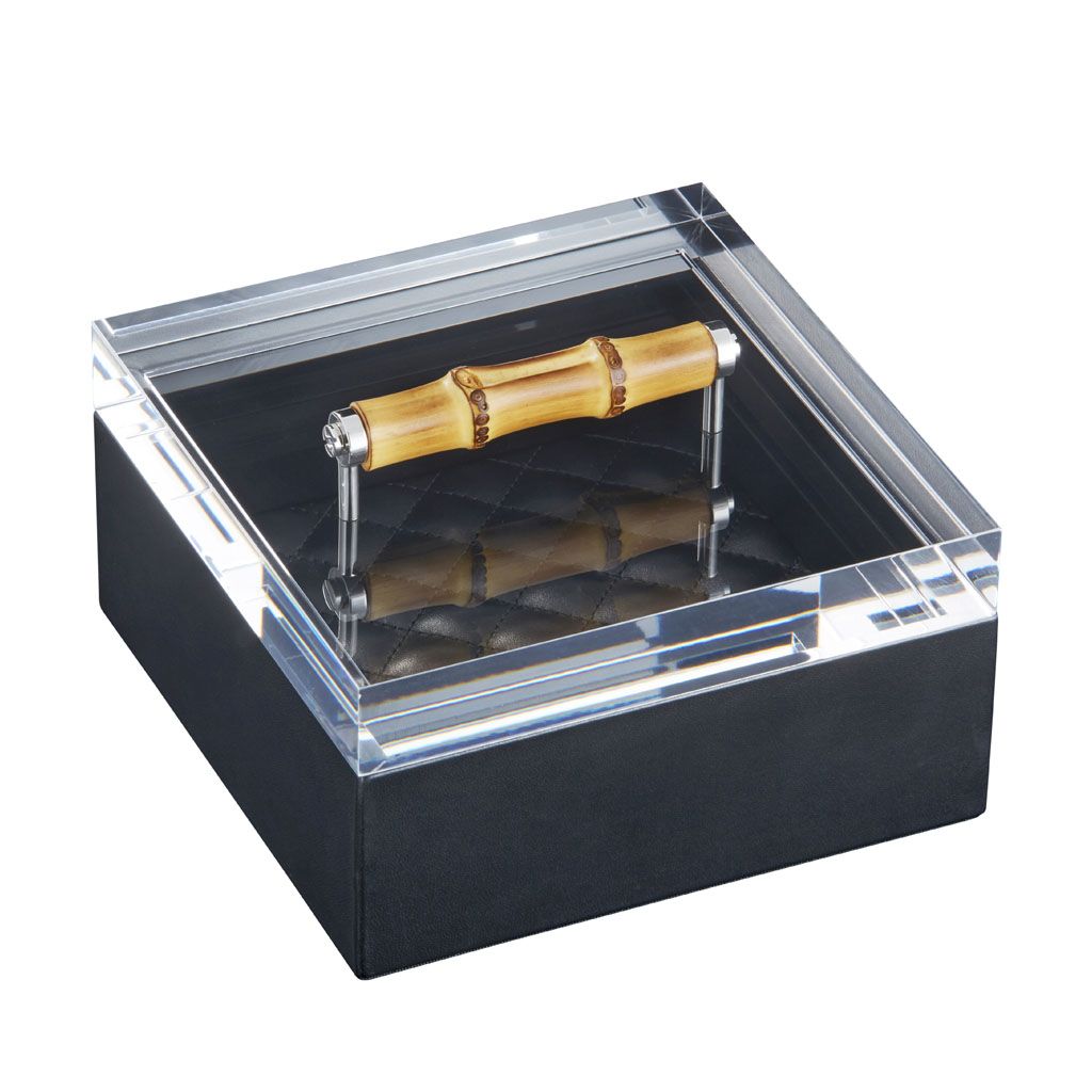 Leather box with acrylic lid, quilted diamonds padded lining, bamboo handle.