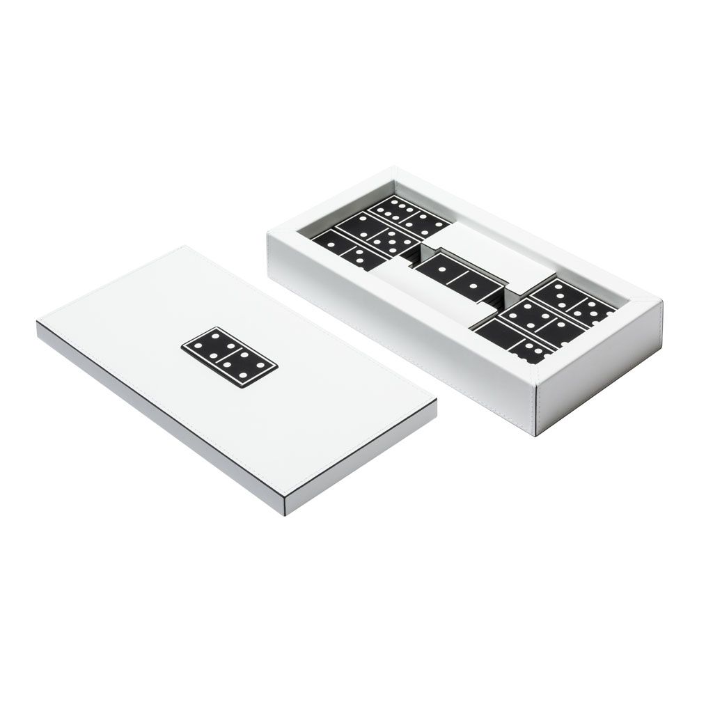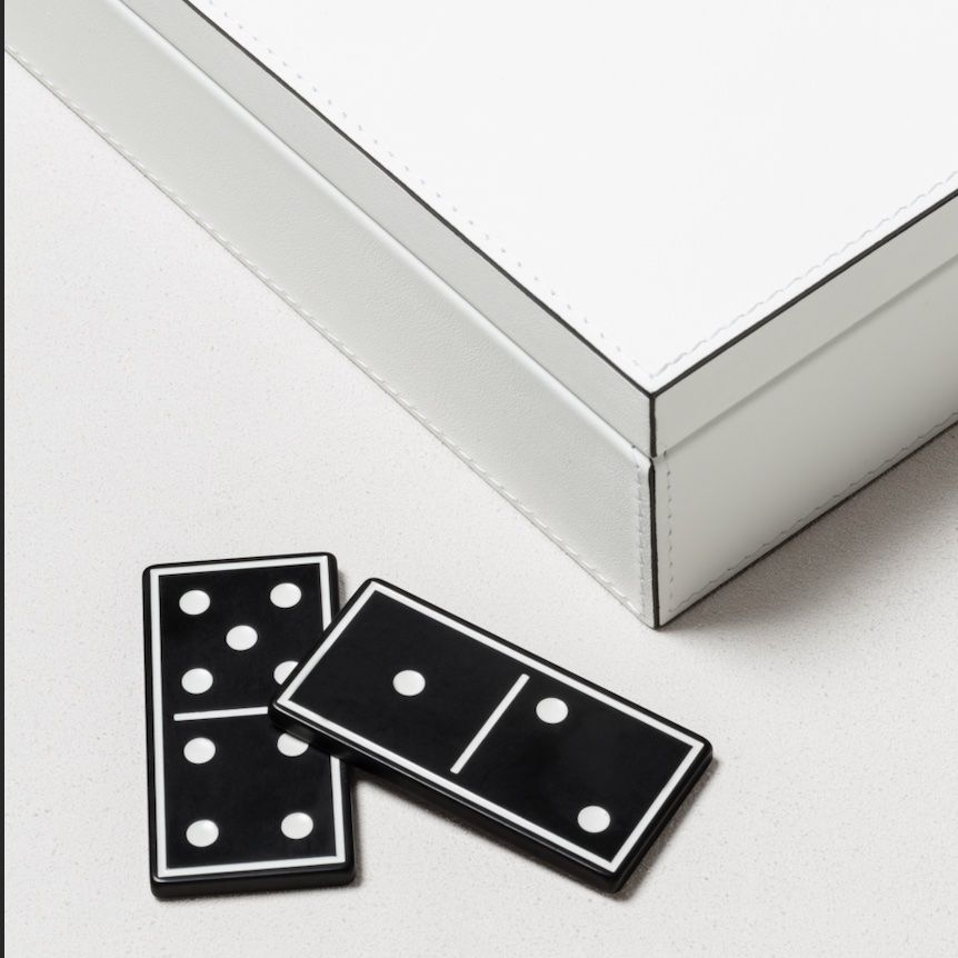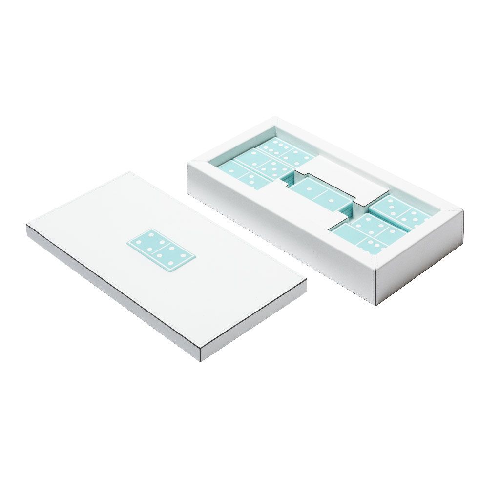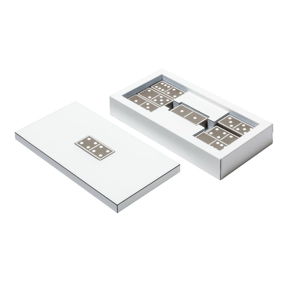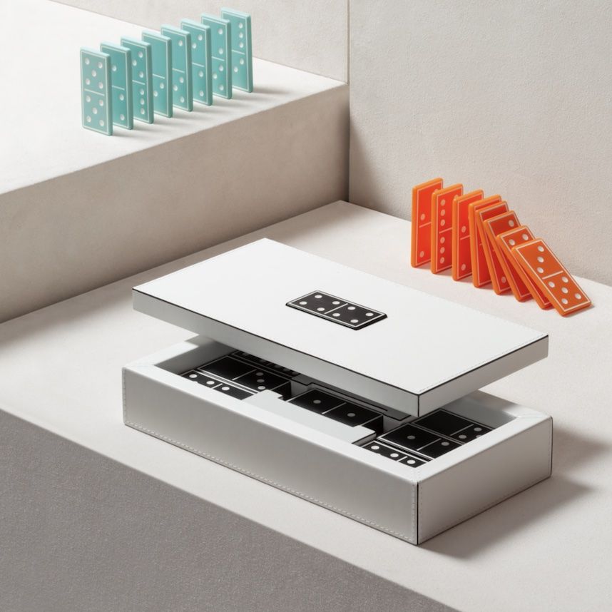 A timeless game presented in a fine leather box featuring an iconic decorative domino piece embedded on the lid.
