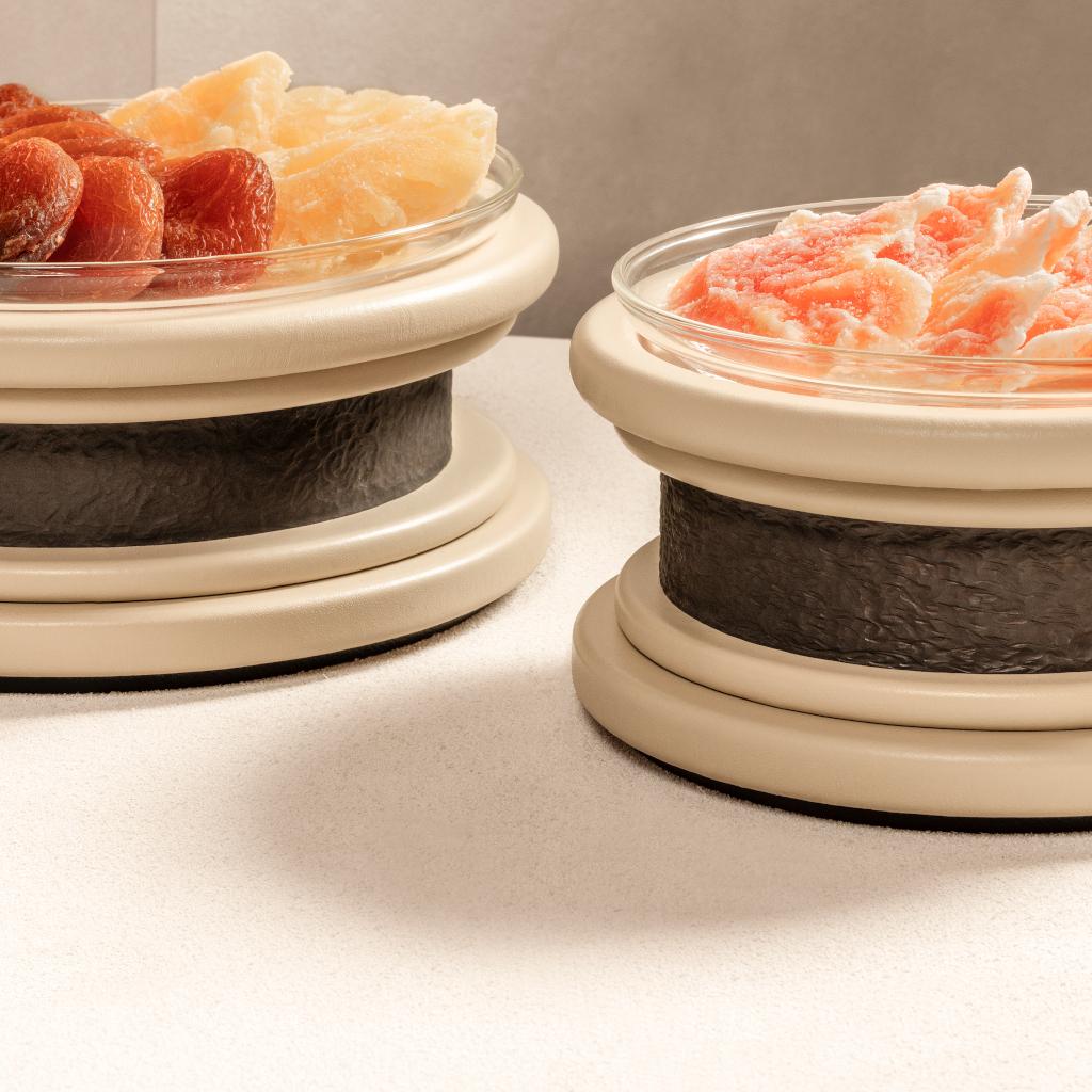 Dune takes form from gestures of use rather than from ceremony alone. Incense boxes, an incense holder are unified by smooth, rounded silhouettes, wrapped in leather and traced with accents of hammered, burnished bronze. The metal surfaces carry gentle irregularities, like dunes seen from above, marked by wind, softened by time, catching light with a warm, shifting depth. While conceived with Ramadan in mind, Dune speaks to moments of gathering, reflection, and hospitality, yet each piece moves naturally beyond a single occasion. The trays lend themselves to table settings and shared offerings; the incense elements become enduring accents within the interior, holding scent, memory, and atmosphere. Grounded in clarity