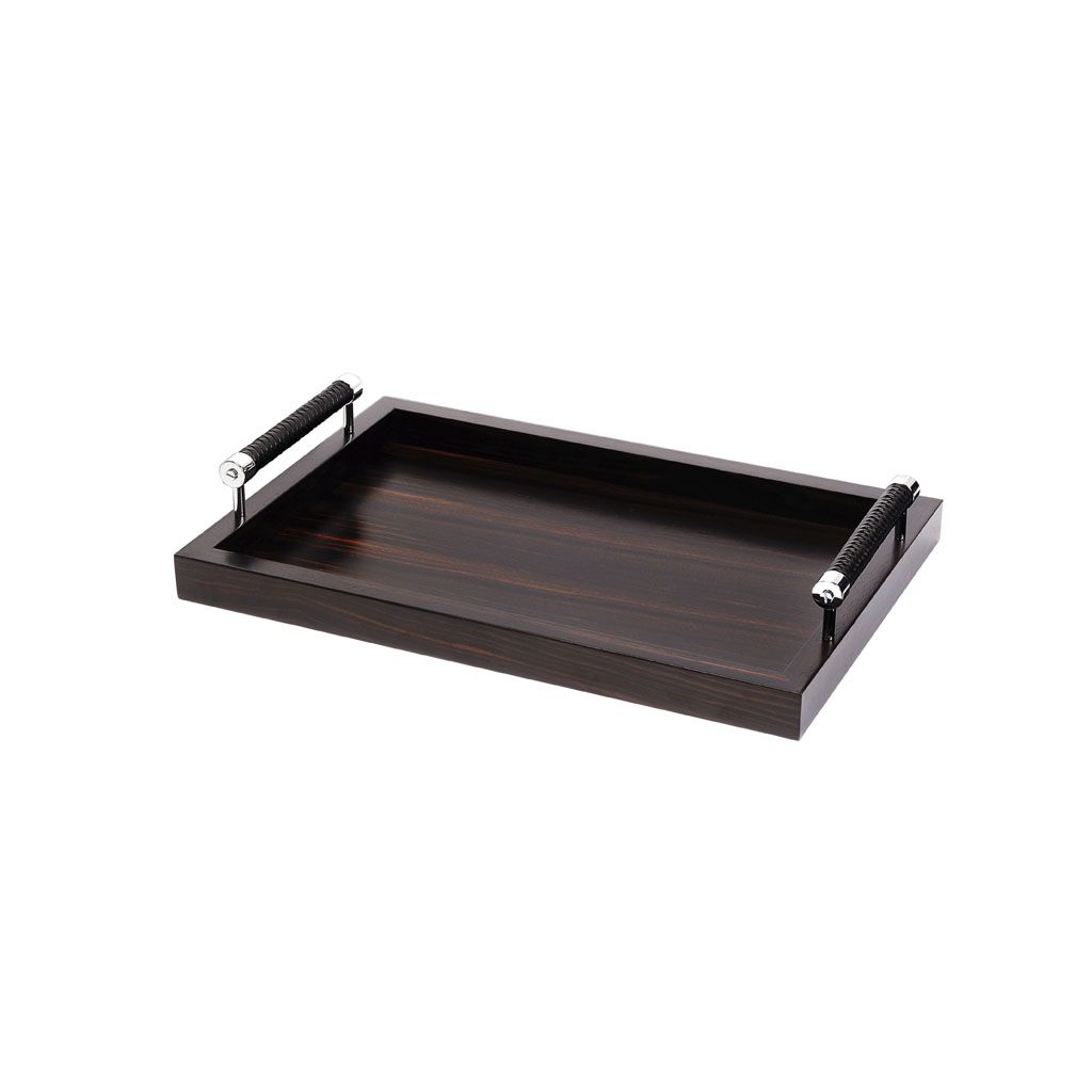 Macassar ebony tray with handwoven leather handles.