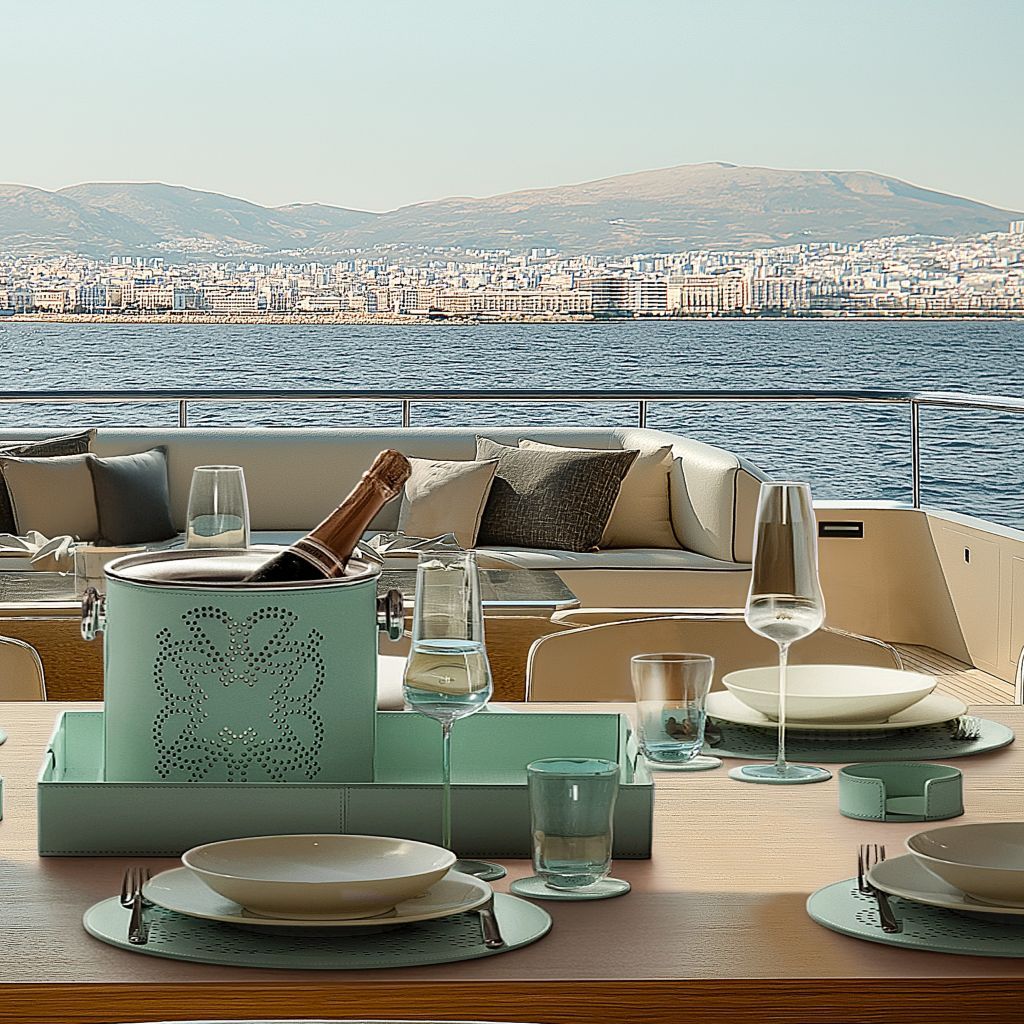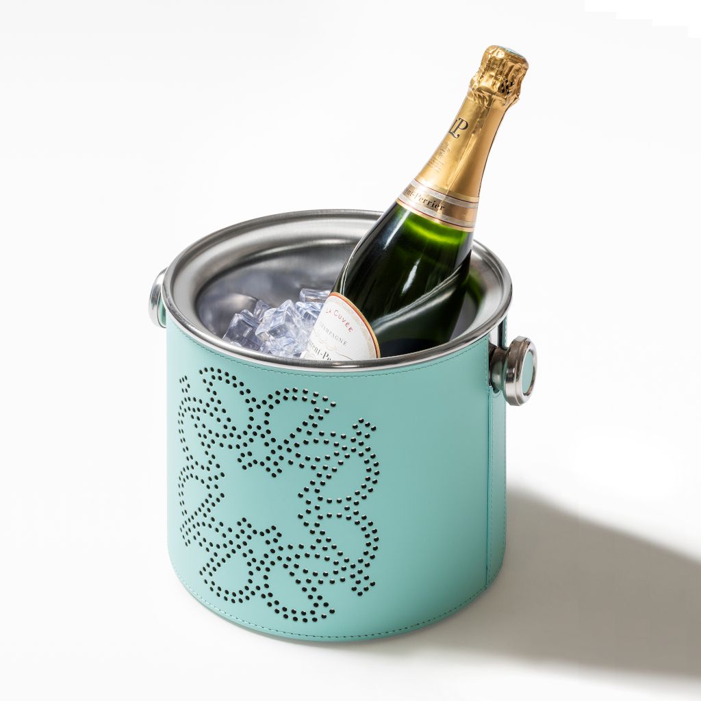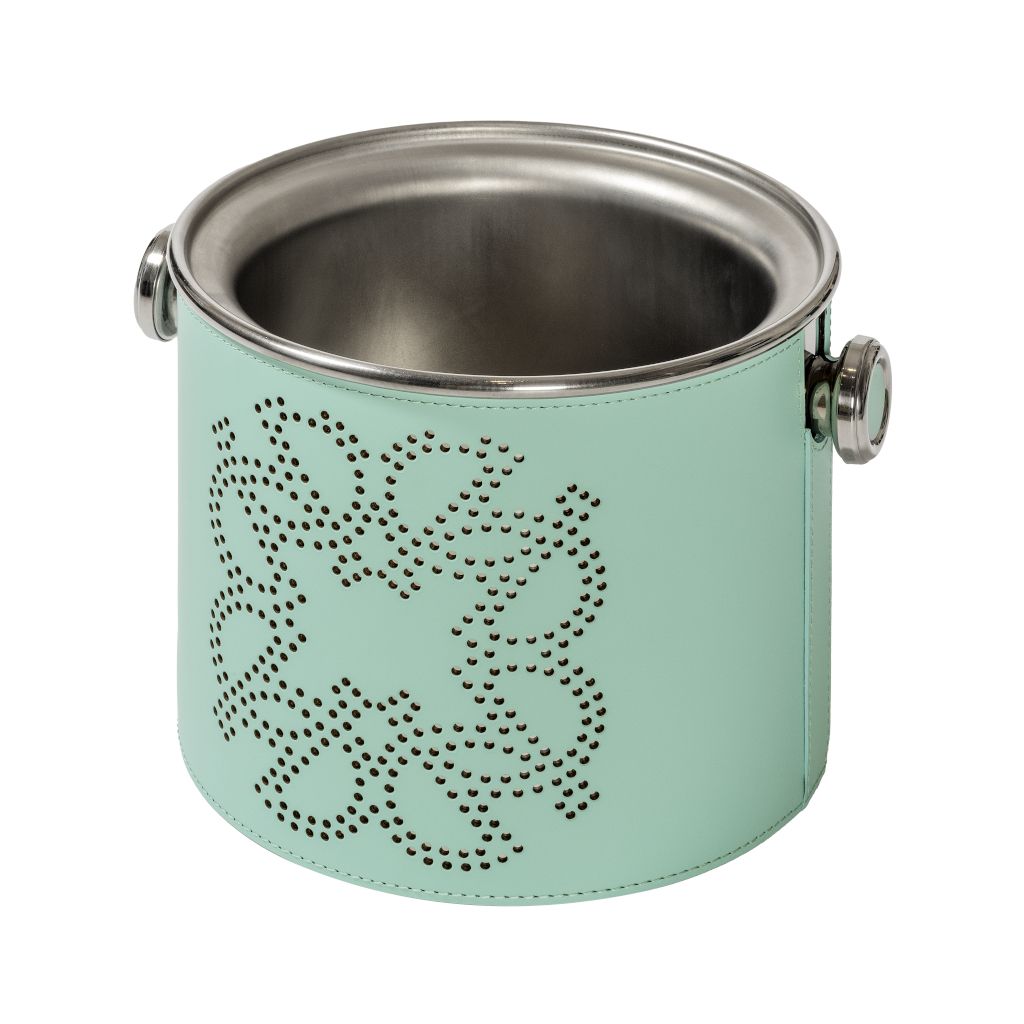 Stainless steel thermic champagne bucket covered with water-resistant and UV-resistant finish, featuring a perforated ELIE SAAB Monogram on two sides.