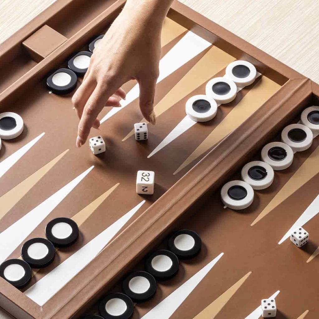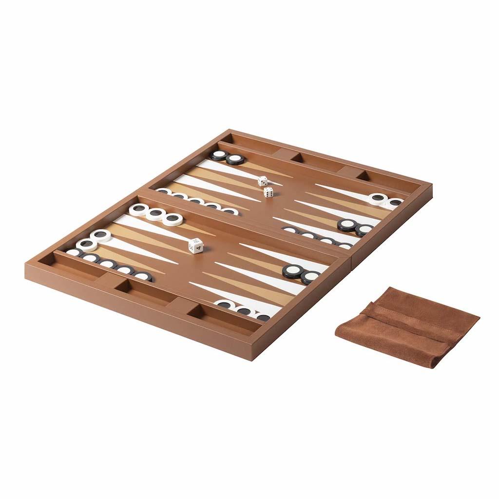 The set is equipped with two sets of shiny plexiglass backgammon checkers, 4 dice and a doubling cube, all stored in a fine suede bag.