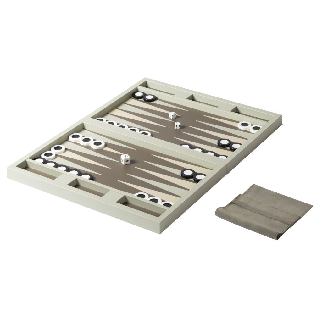 The set is equipped with two sets of shiny plexiglass backgammon checkers, 4 dice and a doubling cube, all stored in a fine suede bag.