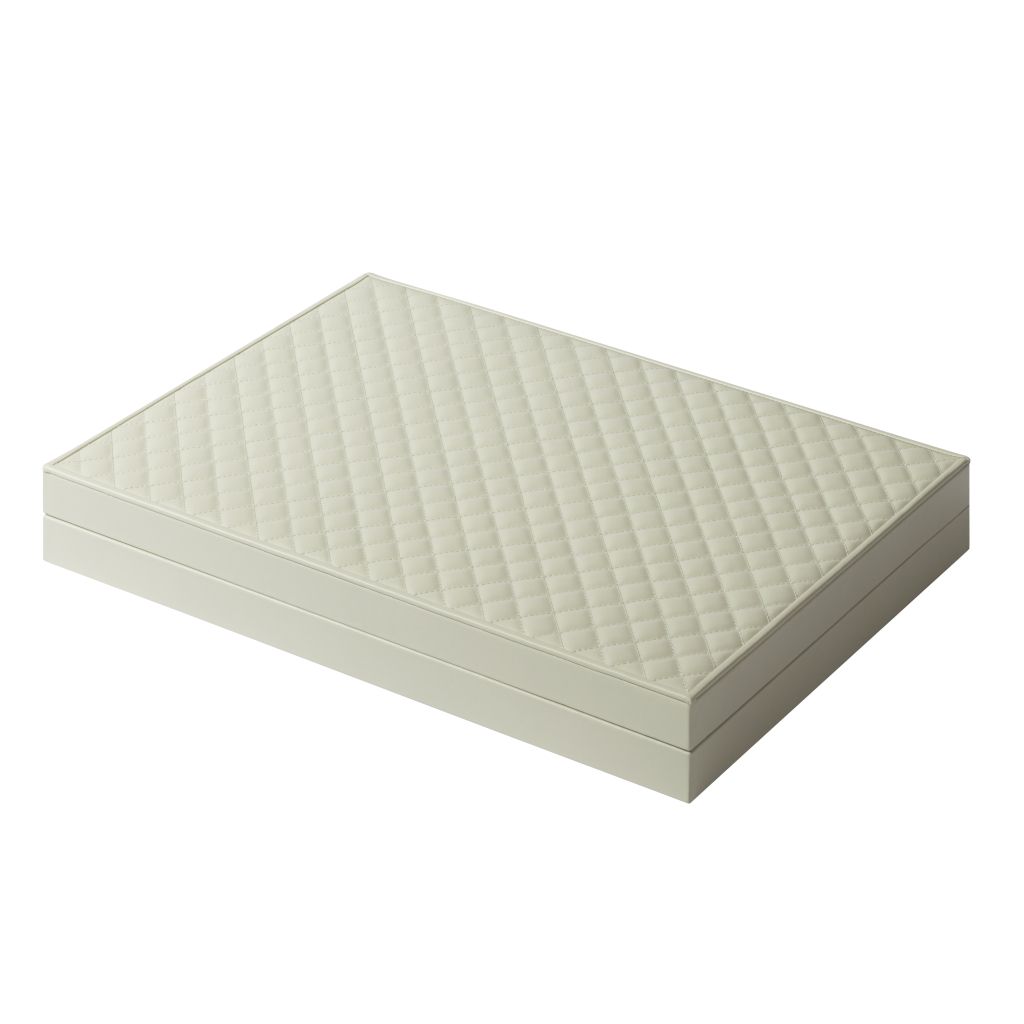 Leather-covered backgammon case with quilted diamonds leather lid and inlaid leather playing field.