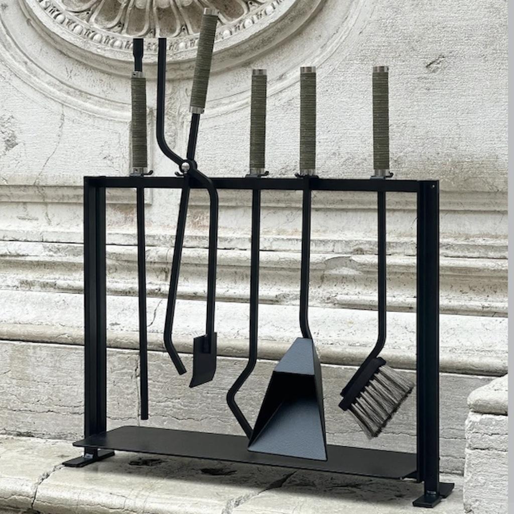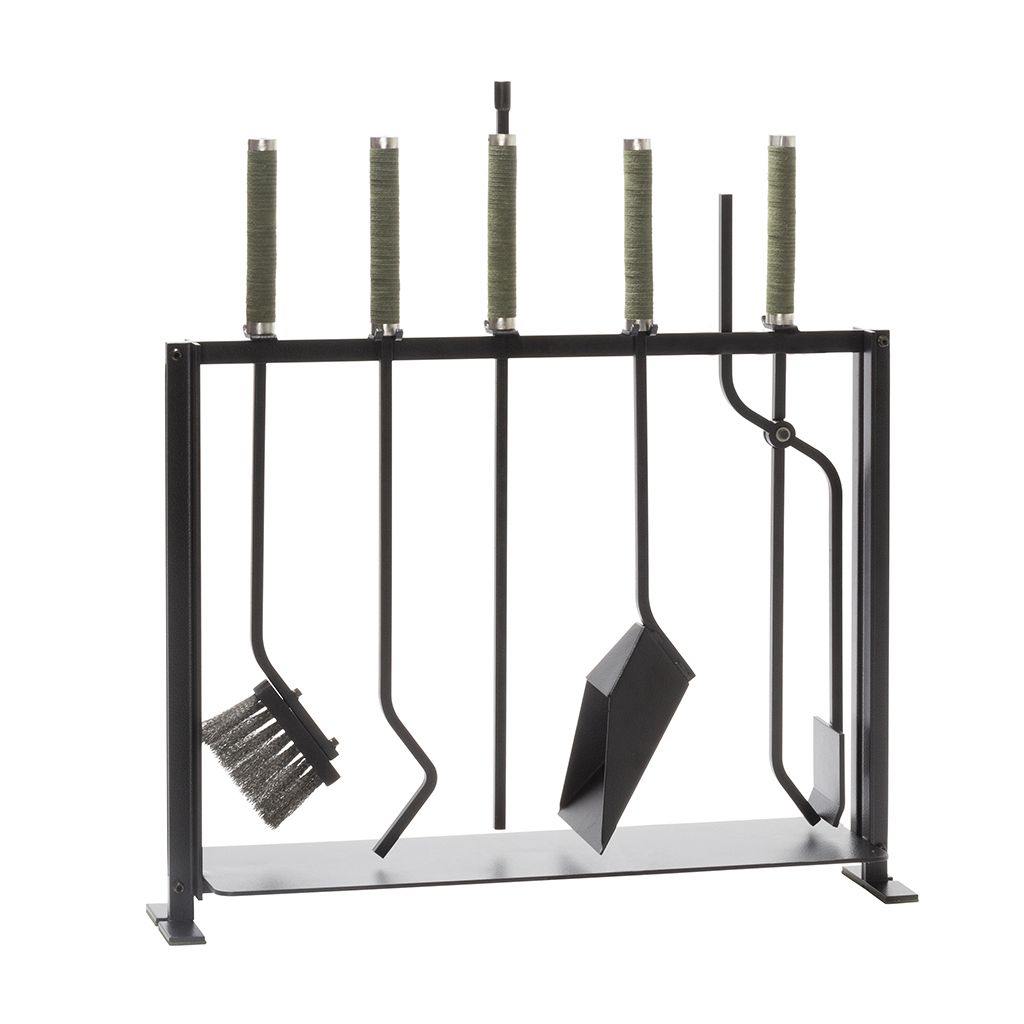 The set is equipped with a fireplace brush, a fire poker, a blow poke, fireplace tongs and a coal shovel.