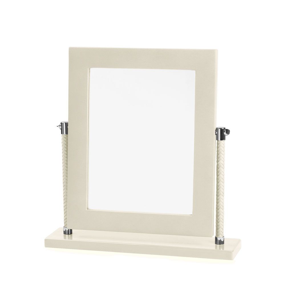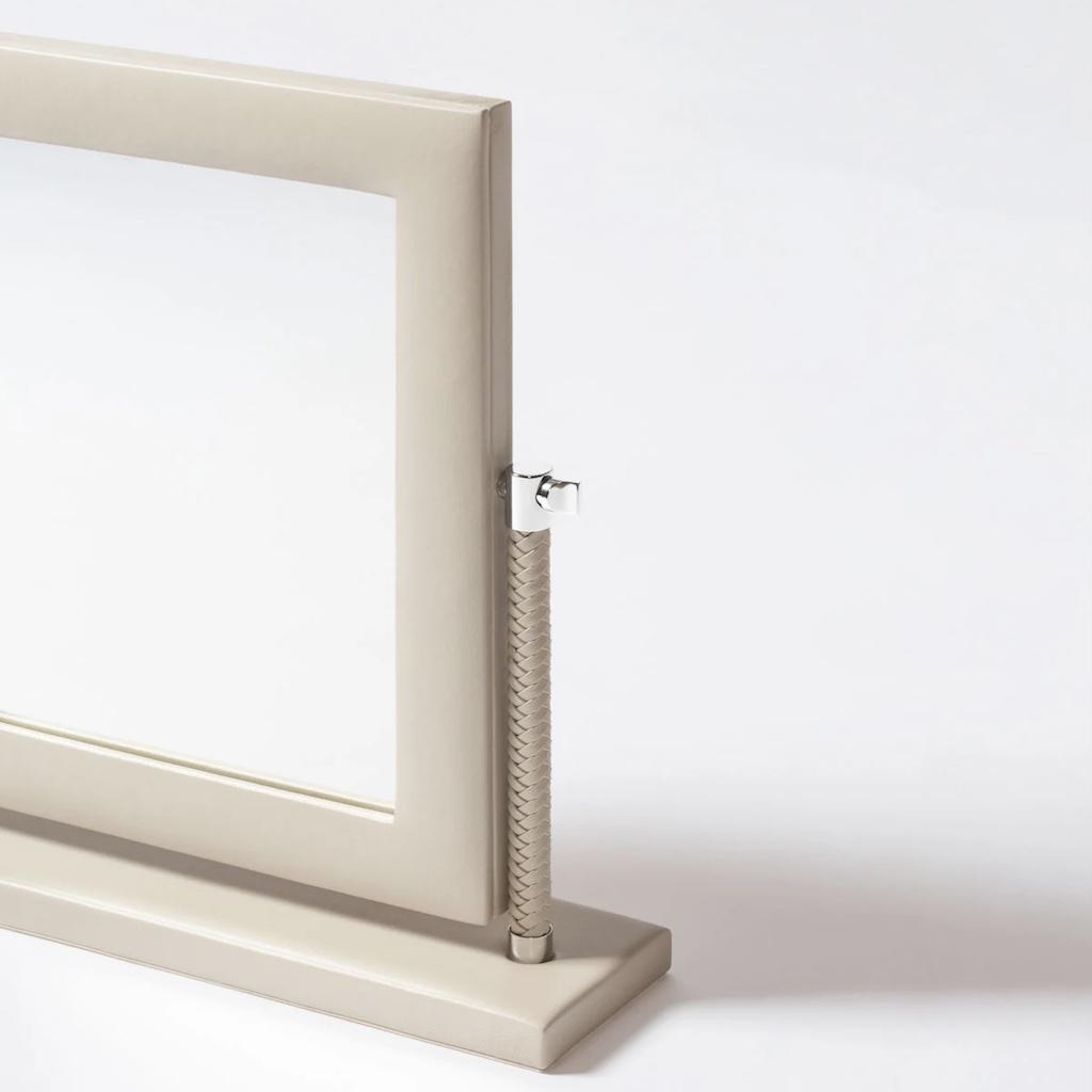 Leather vanity mirror with chrome or gold details.