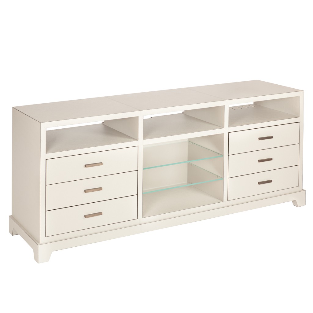 Bookshelves and cabinet equipped with fridge, coffee machine or other accessories.