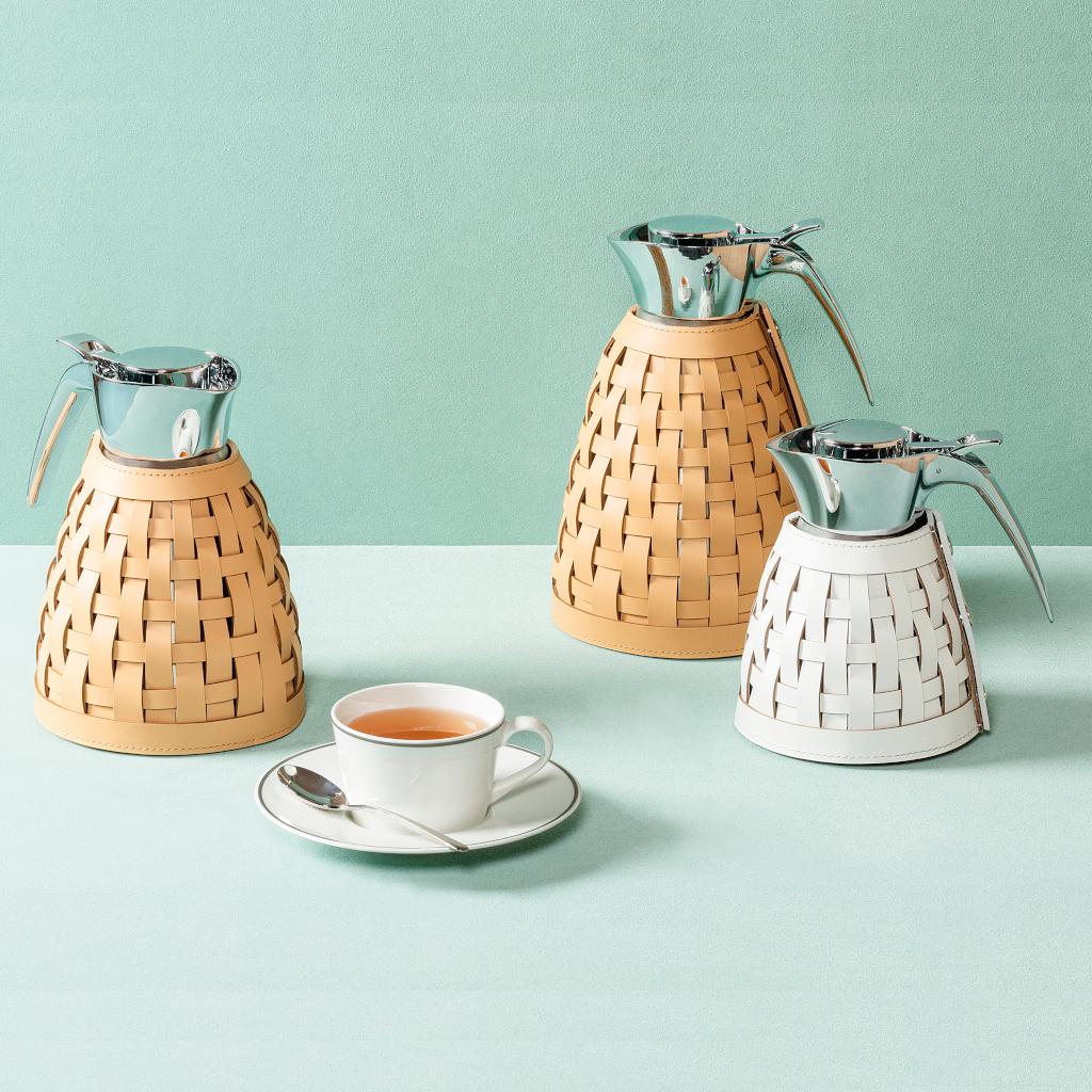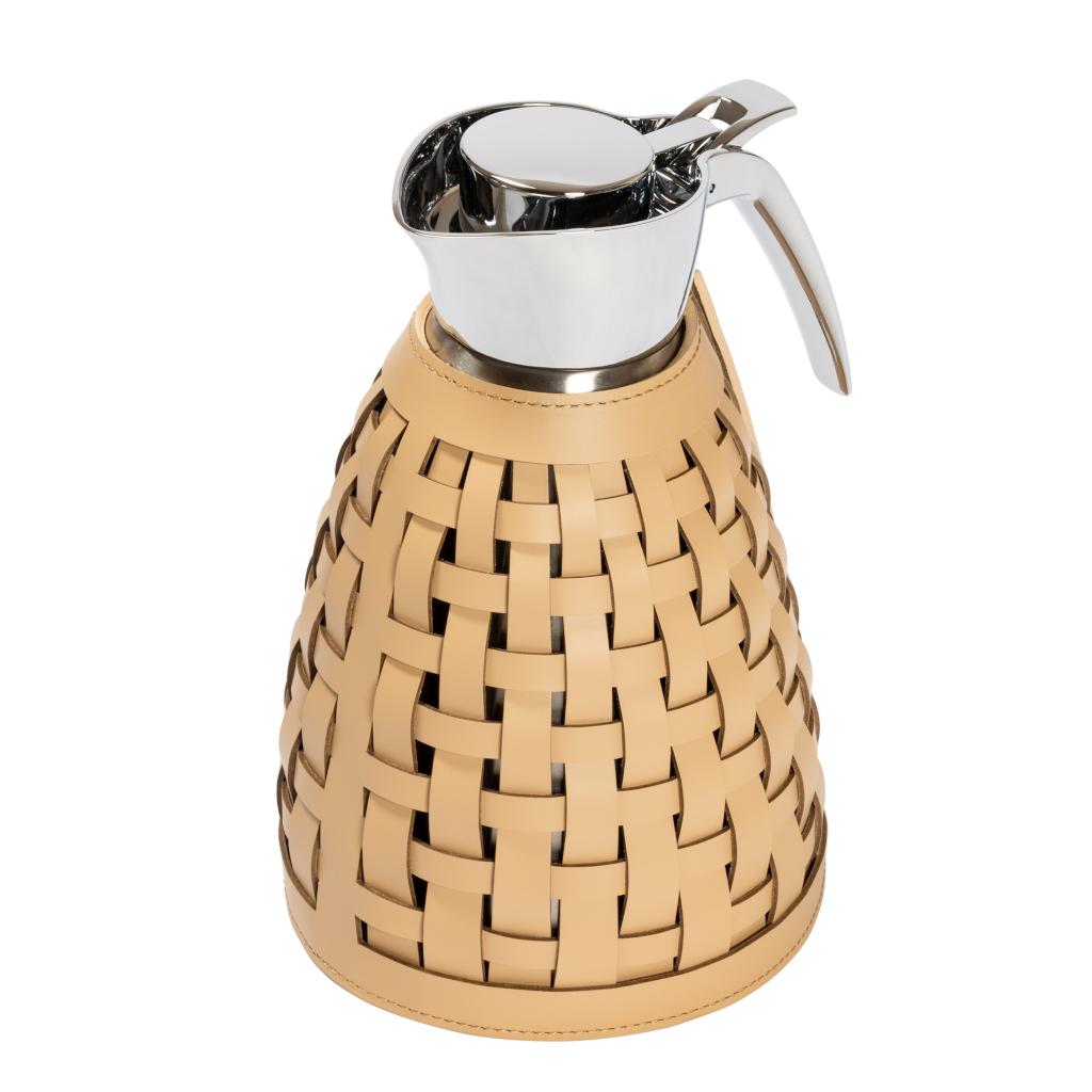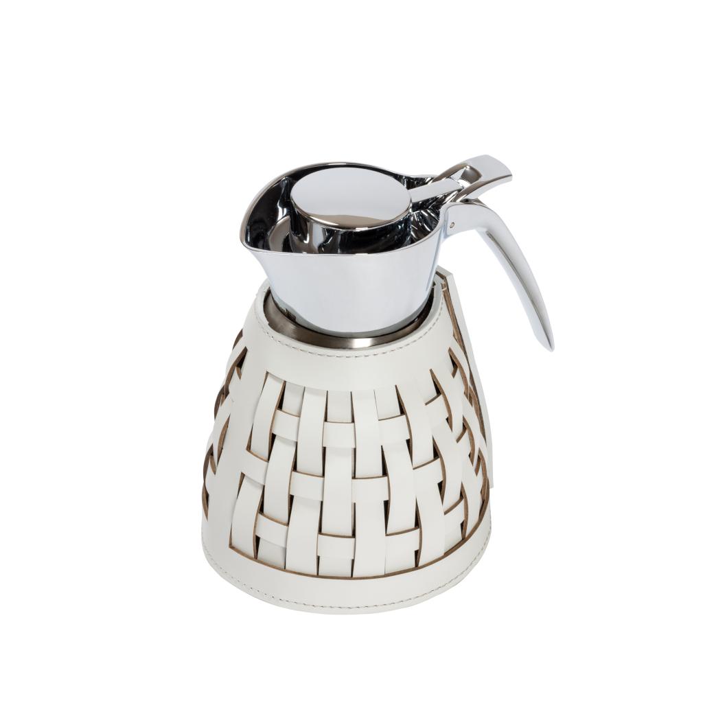 The stainless steel structure is partially dressed with an exquisite woven finest regenerated leather cover, which is also removable to ensure an easy cleaning. Precise pouring is ensured thanks to the specially developed hinged lid with one-hand operation.