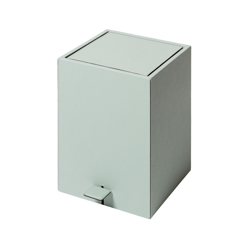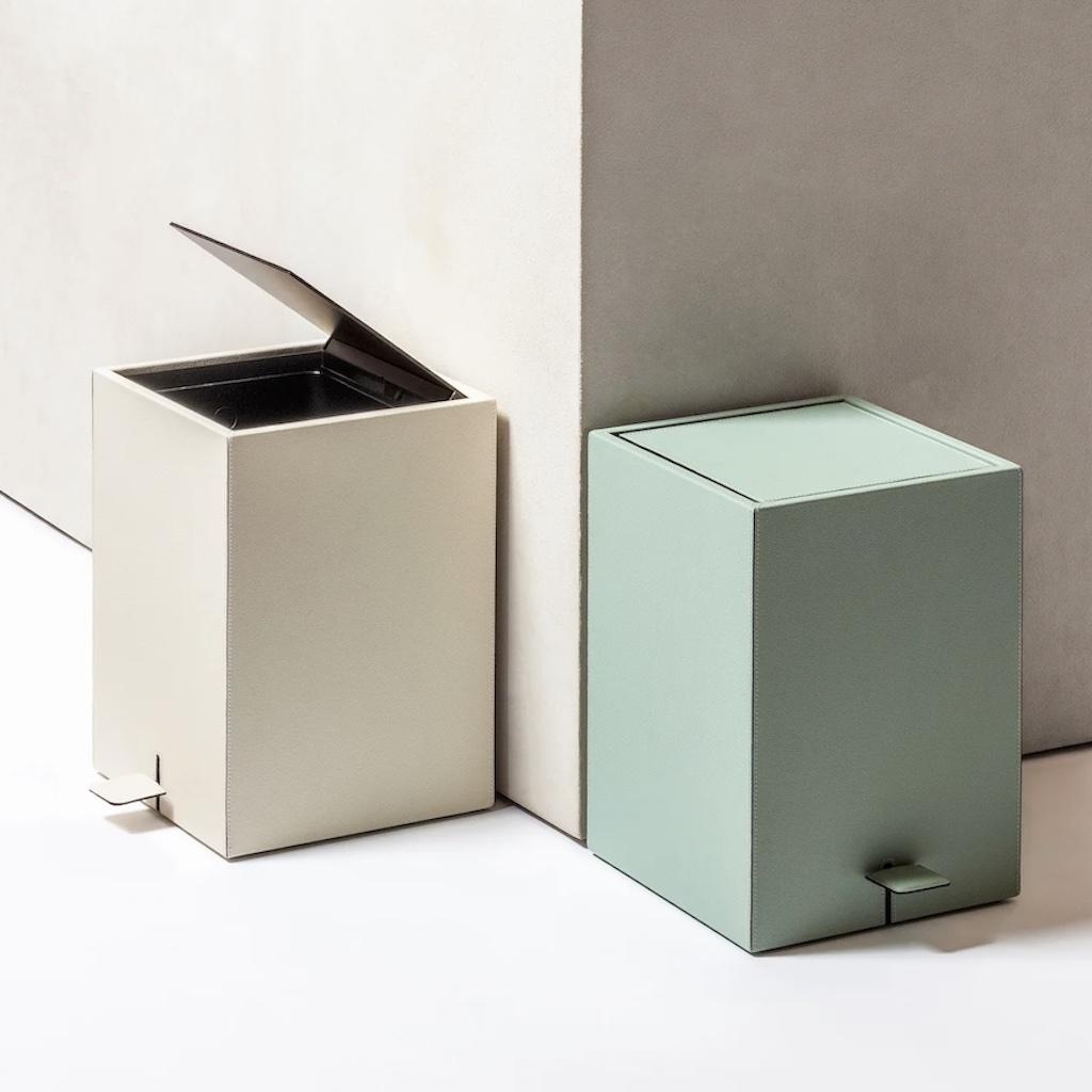 Leather-covered wood structure with non-slip waterproof rubber base underneath and leathercoverd pedal. The removable plastic inner container grant an easy cleaning.