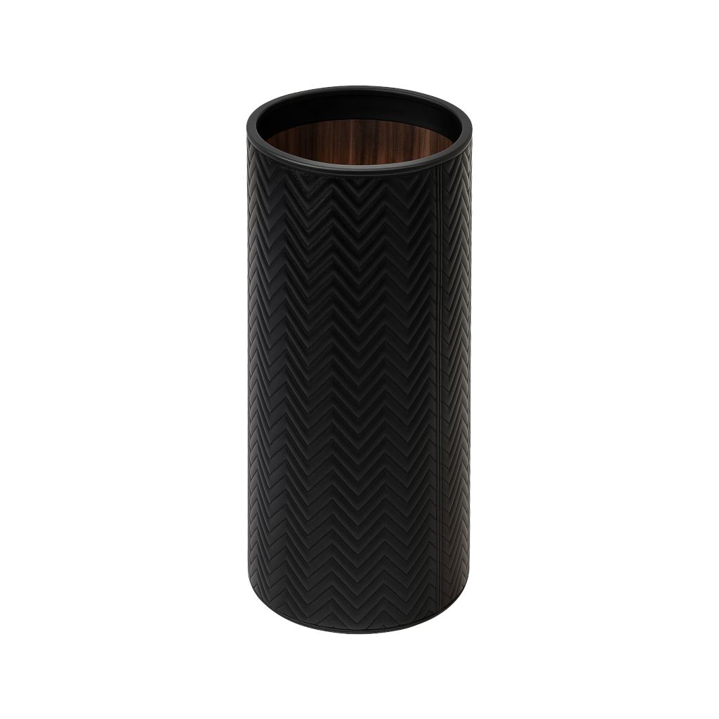 Round waste basket, quilted herringbone padded leather cover, lining in varnished wood.