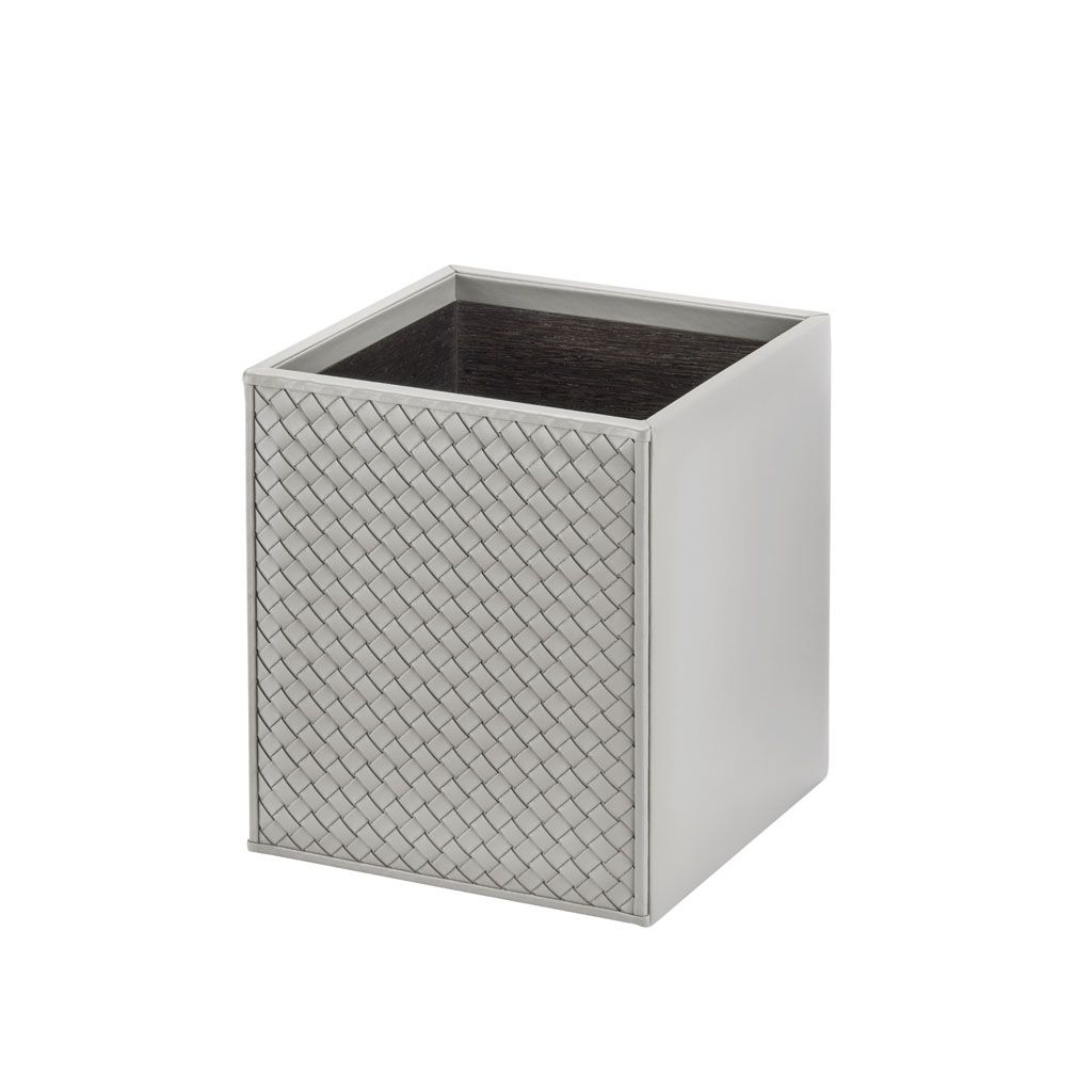 Waste basket, handwoven leather on two sides, lining in varnished wood.